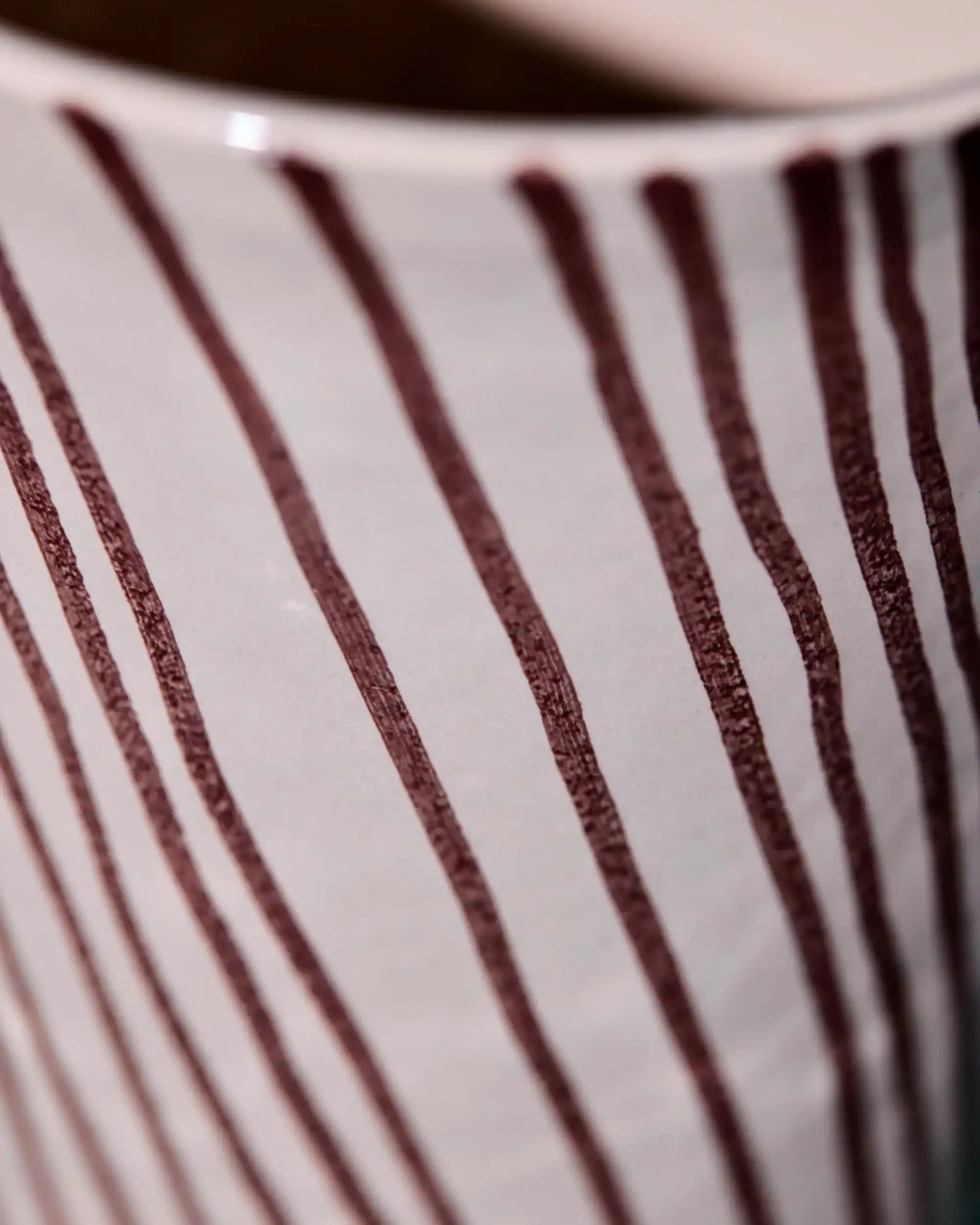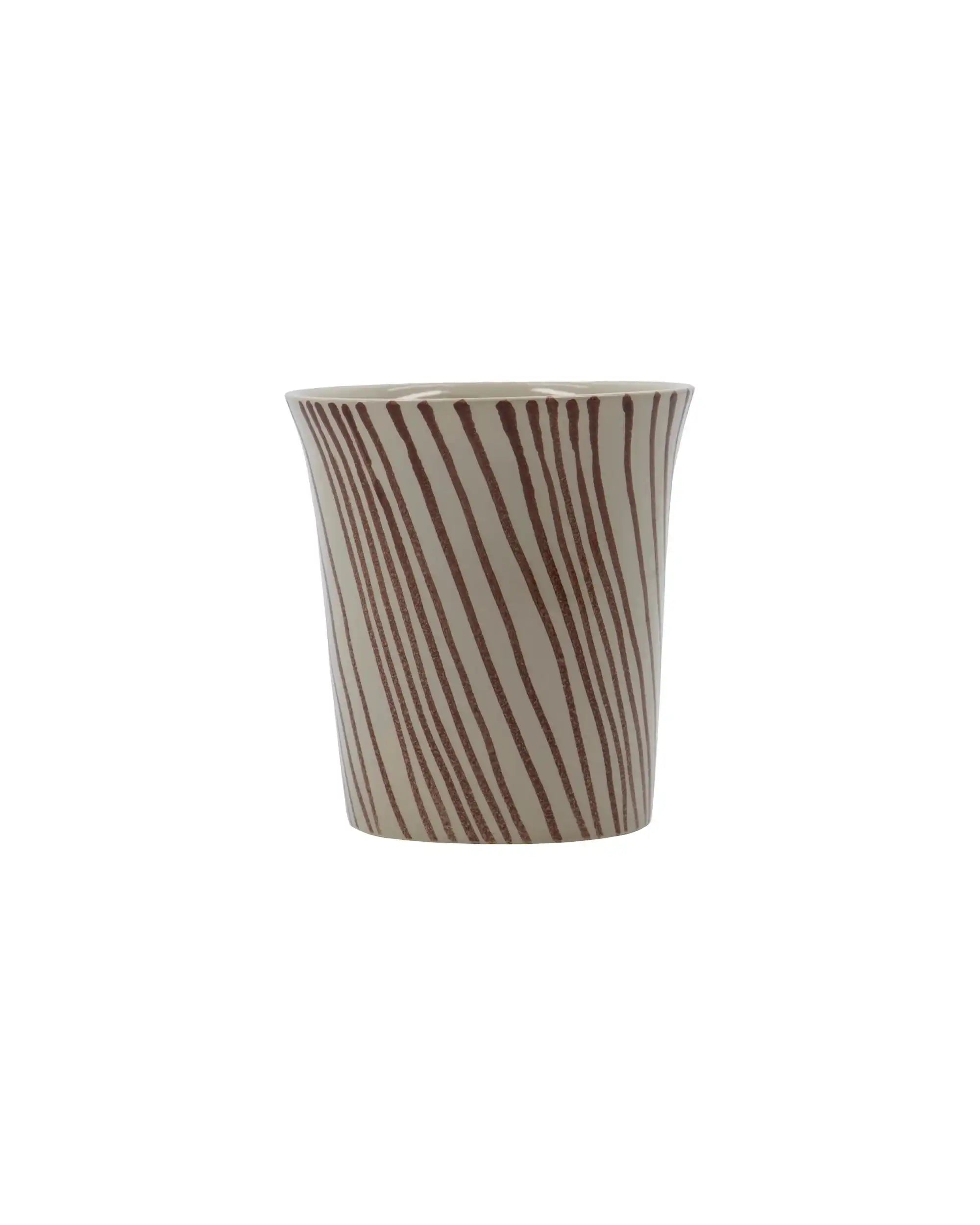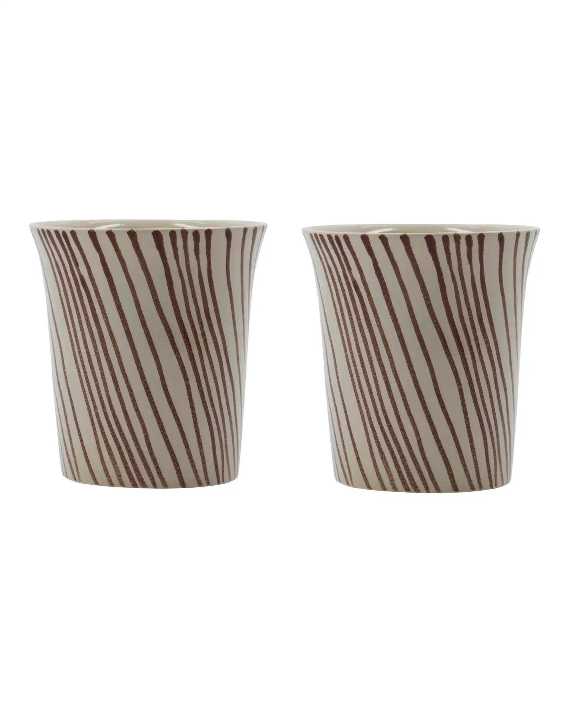 Die Tassen haben eine dezent konische Form und liegen dadurch angenehm in der Hand. Die warme braune Farbe und das verspielte Streifenmuster sorgen für eine stimmungsvolle, fröhliche Note beim Frühstück oder deiner Kaffeepause. Kombiniere sie mit einfarbigem Geschirr für Ruhe oder mixe sie mit anderen Mustern für einen lebendig gedeckten Tisch.