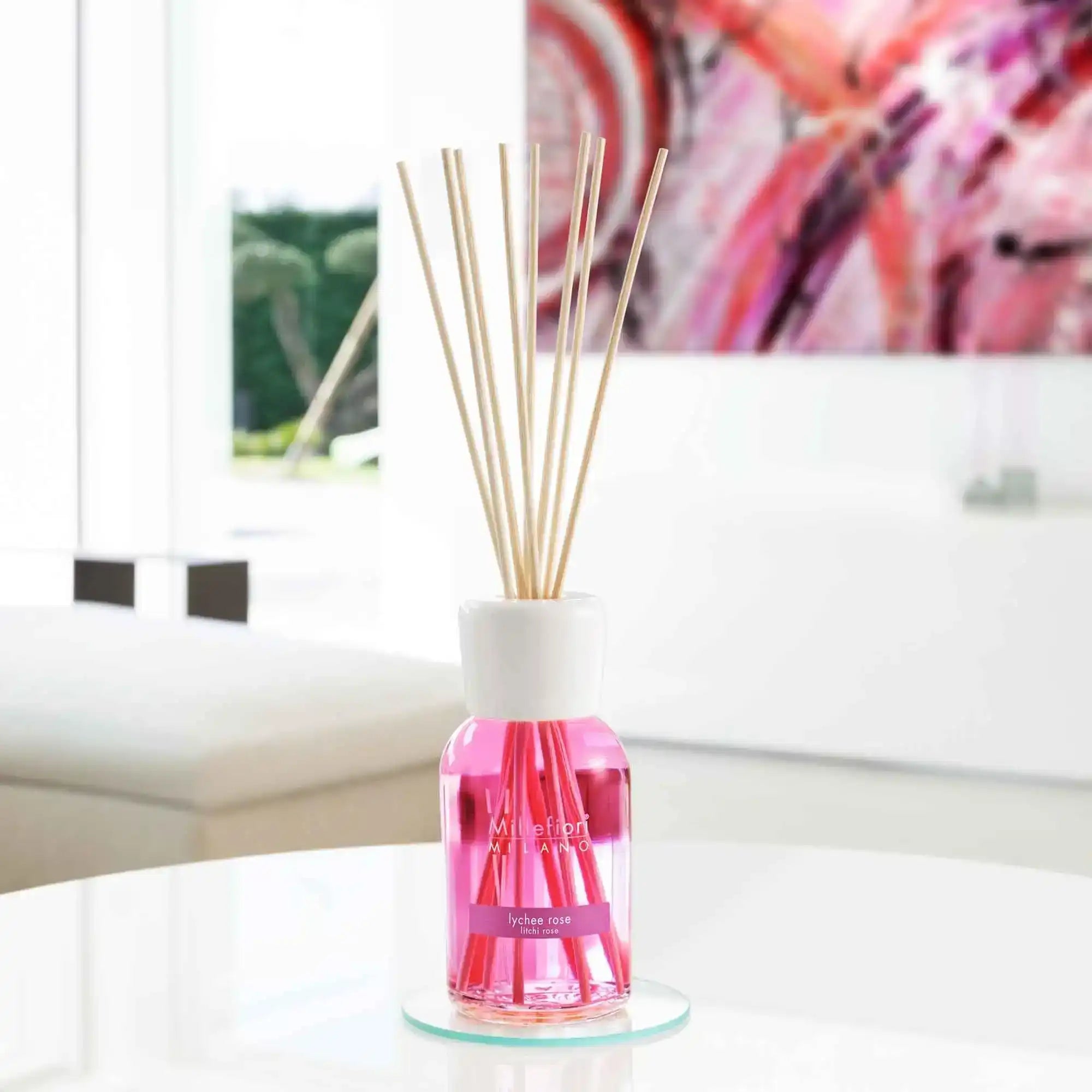 Suchst du einen Duft, der sanft und zugleich verführerisch ist? Die Millefiori Milano Nachfüllung Lychee Rose bringt eine blumige Eleganz in dein Zuhause, die immer wieder fasziniert. In dieser 250 ml Nachfüllflasche dreht sich alles um die Damascena-Rose – die Königin der Blumen – dezent kombiniert mit der Frische von Litschi und einer würzigen Note von Timurpfeffer. Der Duft wird abgerundet durch Geranie, Moschus und eine warme Basis aus Zedernholz. Ein raffinierter und sinnlicher Duft, der dein Interieur in Sanftheit und Stil hüllt.