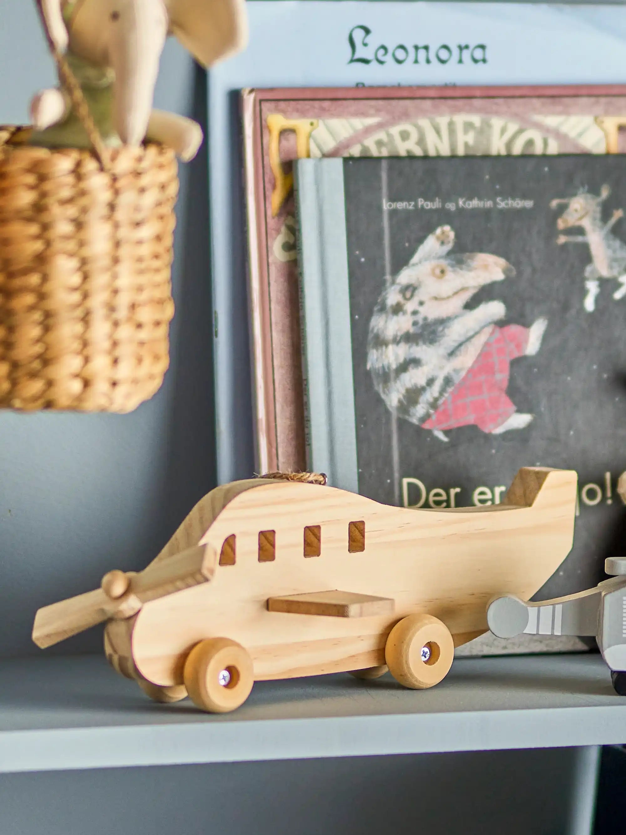 Details & Material: Hergestellt aus FSC-zertifiziertem Kiefernholz in Naturfarbe. Das sieht nicht nur schön aus, sondern ist auch eine bewusste Wahl. Mit den Maßen 10,5 × 9,5 × 25,5 cm passt es problemlos in kleine Ecken, und die fröhliche Flugzeugform bleibt immer gut sichtbar. Die Schnur kannst du einfach durch ein längeres Band ersetzen, um es auf die perfekte Höhe zu hängen. So bekommt das Zimmer einen verspielten Akzent, ohne überladen zu wirken.