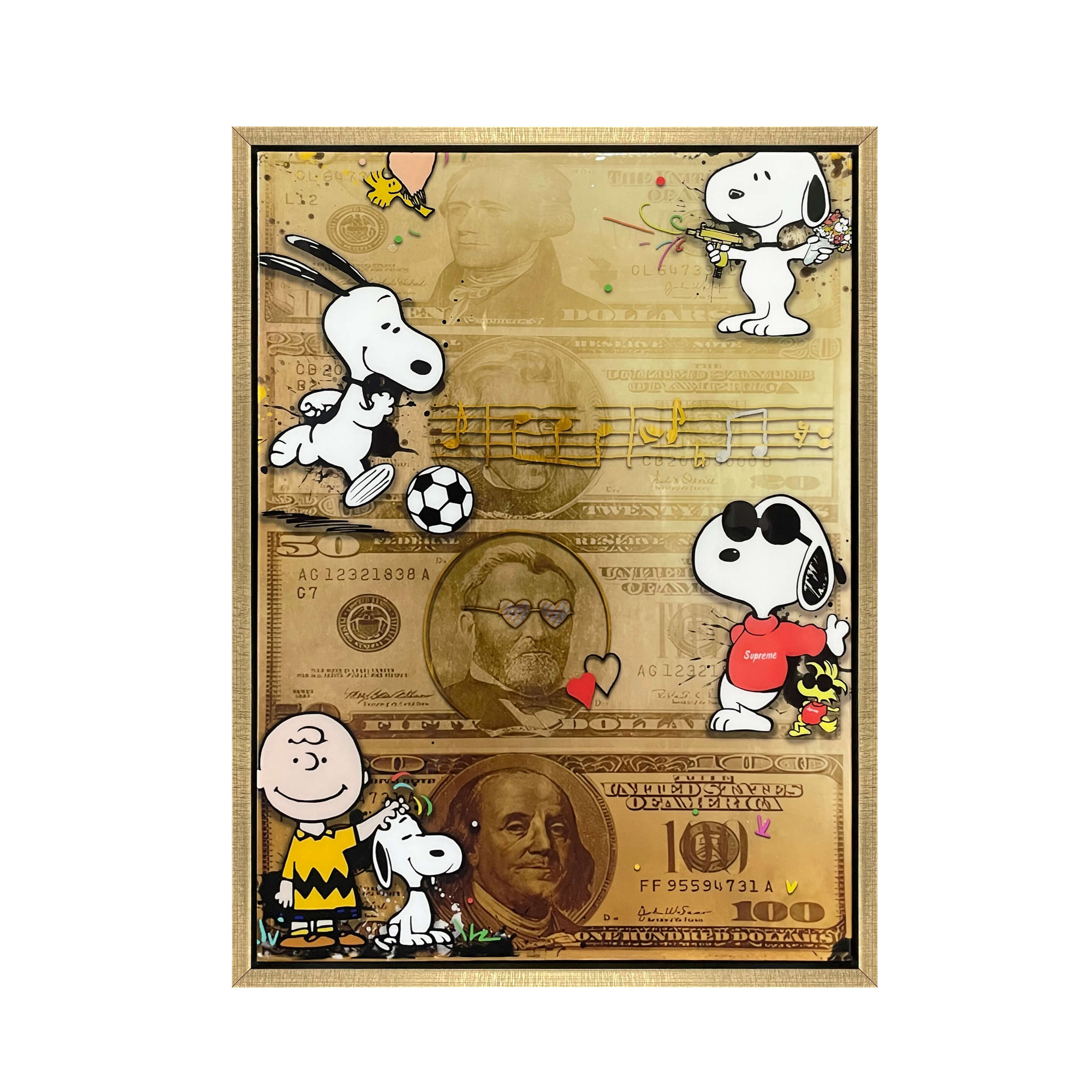 Der Hintergrund mit Geldmotiv und Goldtönen verleiht dem Gemälde eine moderne und luxuriöse Ausstrahlung, während die verspielten Figuren für ein fröhliches und kreatives Gesamtbild sorgen.