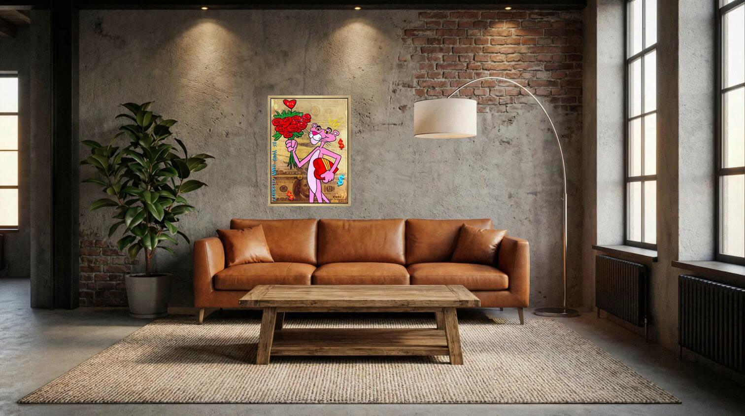 Dieses handgemalte Street-Art-Gemälde zeigt einen eleganten rosa Panther im humorvollen Pop-Art-Stil. Mit einem Rosenstrauß, Geldsymbolen und verspielten Graffiti-Akzenten erhält das Kunstwerk eine moderne, fröhliche Ausstrahlung, die sofort alle Blicke auf sich zieht.