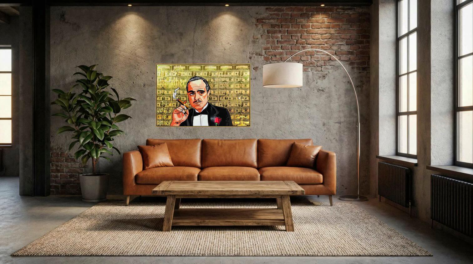 Dieses handgemalte Street-Art-Gemälde zeigt eine ikonische Figur mit Zigarre, umgeben von einem Hintergrund aus Geldmotiven und goldenen Details. Die Kombination aus Pop-Art-Einflüssen, grafischen Linien und Street-Art-Akzenten verleiht dem Bild eine starke und luxuriöse Ausstrahlung.