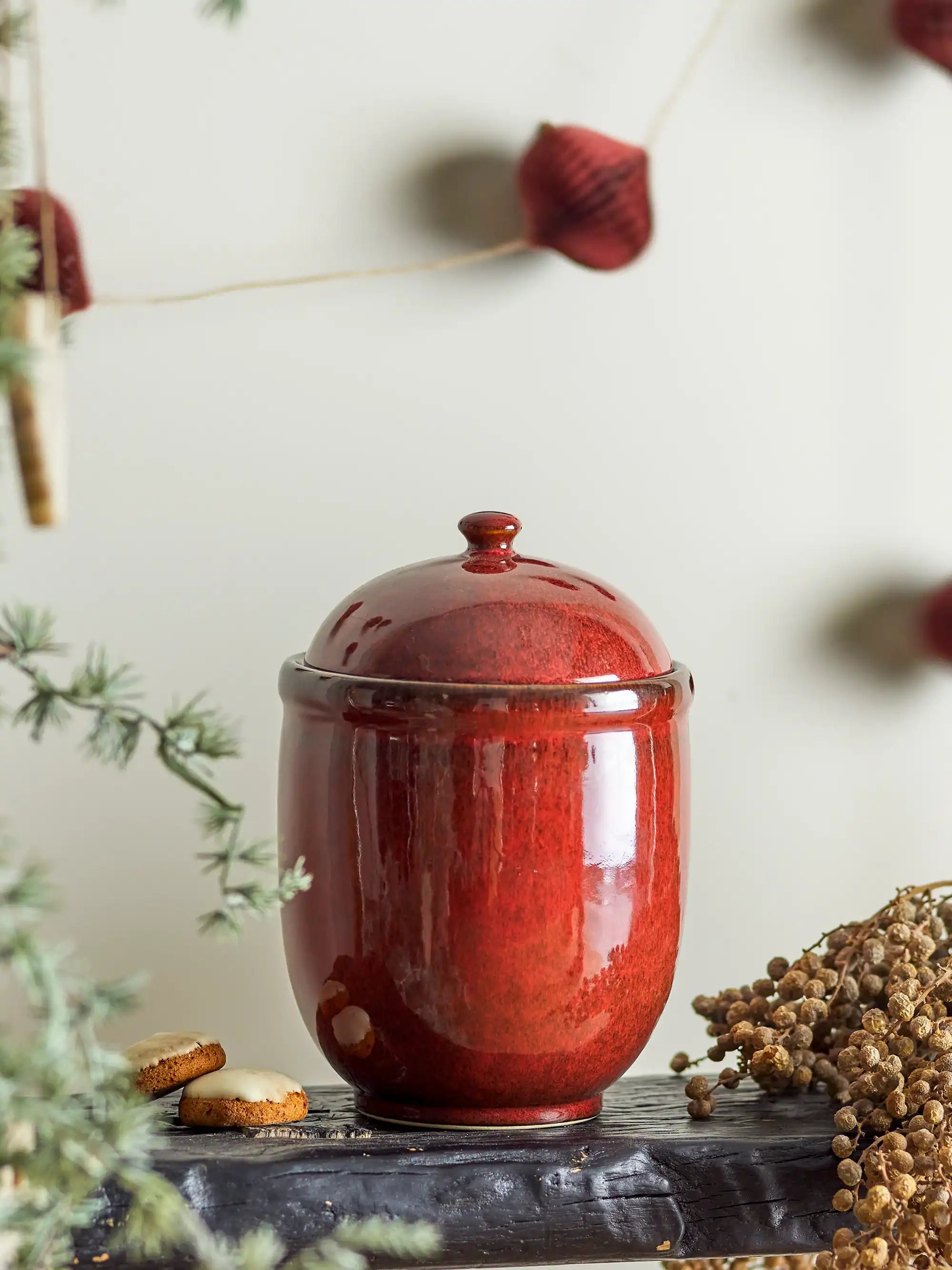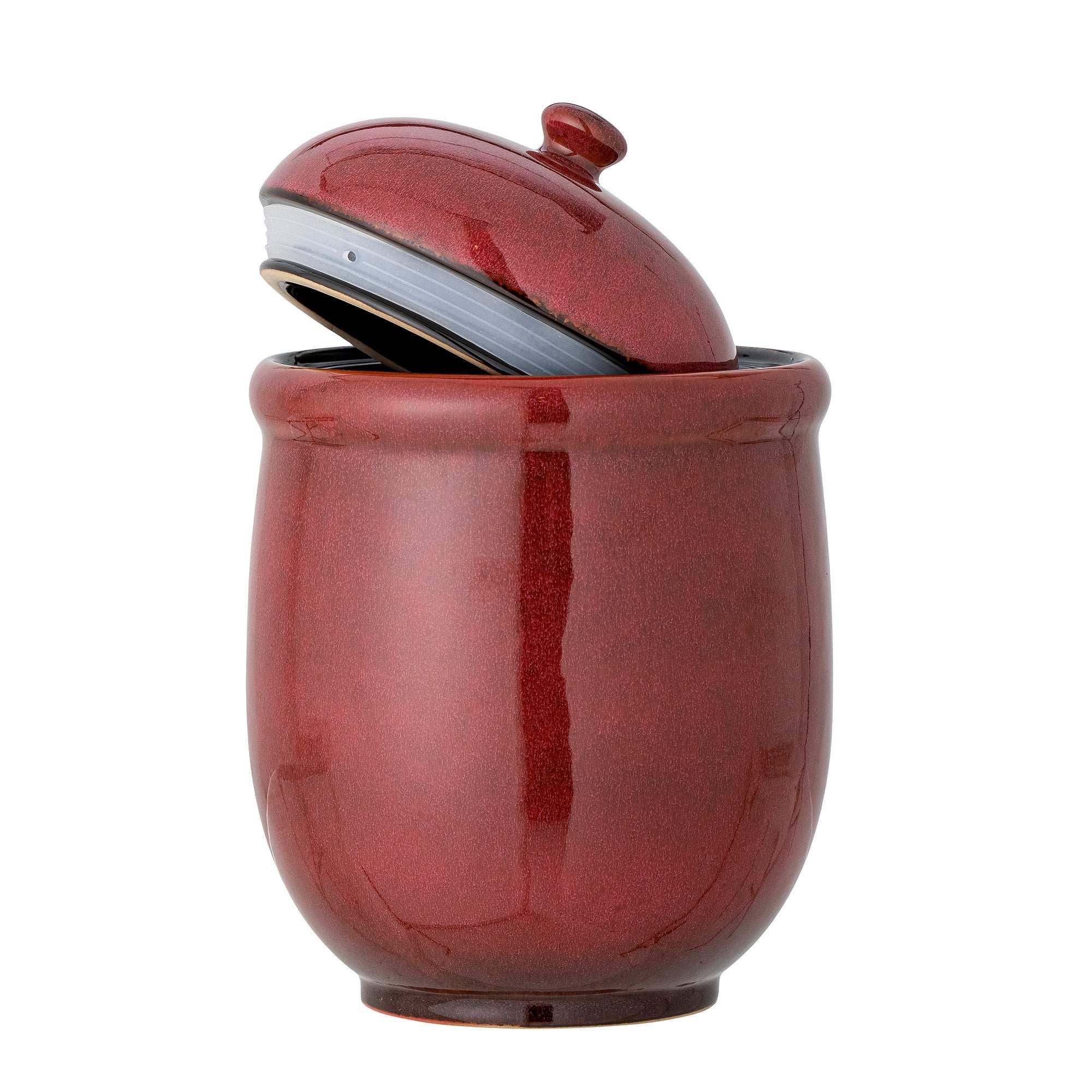 Details & Material: Der Topf ist aus robustem Steingut gefertigt und hat einen tiefroten Farbton, der perfekt zu einem skandinavischen Interieur passt. Mit einer Höhe von 19 cm und einem eleganten Durchmesser von 13 cm bietet dieser Topf ausreichend Platz für allerlei Köstlichkeiten, während der stabile Deckel den Inhalt frisch hält. Das zeitlose Bloomingville-Design sorgt dafür, dass dieser Topf jahrelang ein stimmungsvoller Blickfang bleibt.