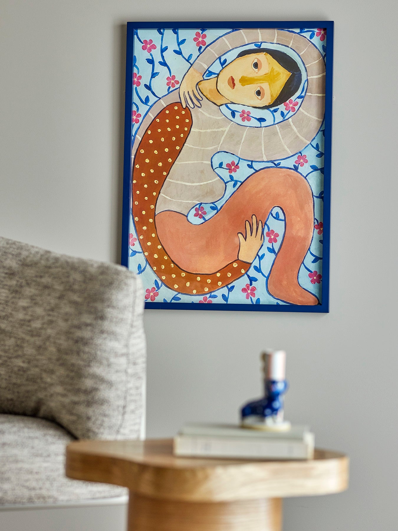 Details & Material: Die Illustration ist auf Papier gedruckt und in einen tiefblauen Rahmen aus Kiefernholz eingesetzt, mit MDF und Glas. Format: b × h × t 2.5 × 72 × 52 cm, schlank an der Wand und groß genug, um eine Wand lebendig wirken zu lassen. Das Glas schützt das Bild vor Staub und hält die Farben klar, während der dunkle Rahmen das Motiv betont und für Ruhe in der Bildgestaltung sorgt.