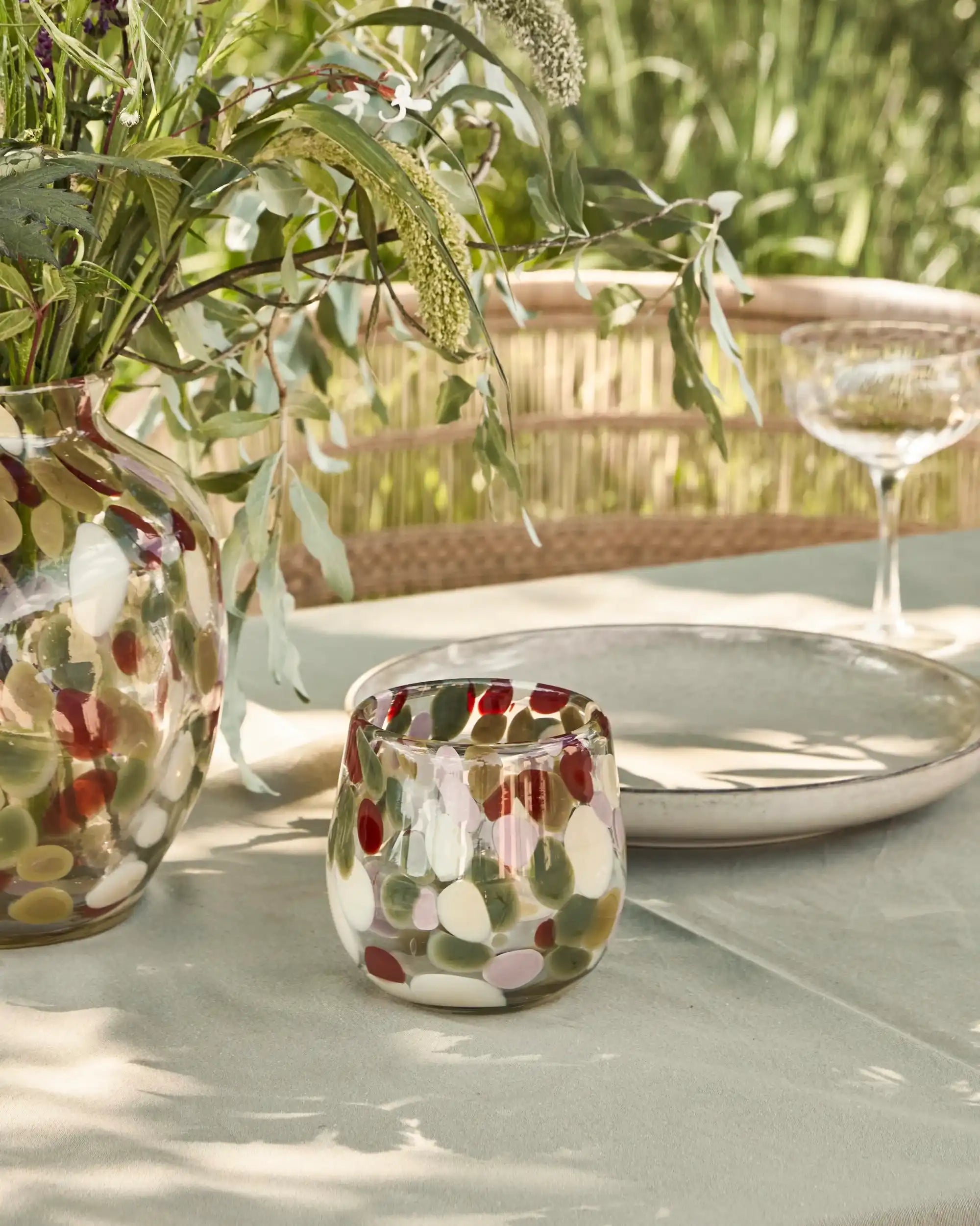 Dekotipp: Kombiniere das sfeerlicht Dot mit anderen Glas-Kerzenhaltern oder Vasen in Uni-Farben für ein verspieltes, aber ausgewogenes Arrangement. Platziere es auf einem Holztablett mit Kerzen, Büchern und grünen Zweigen für ein warmes und einladendes Centerpiece.