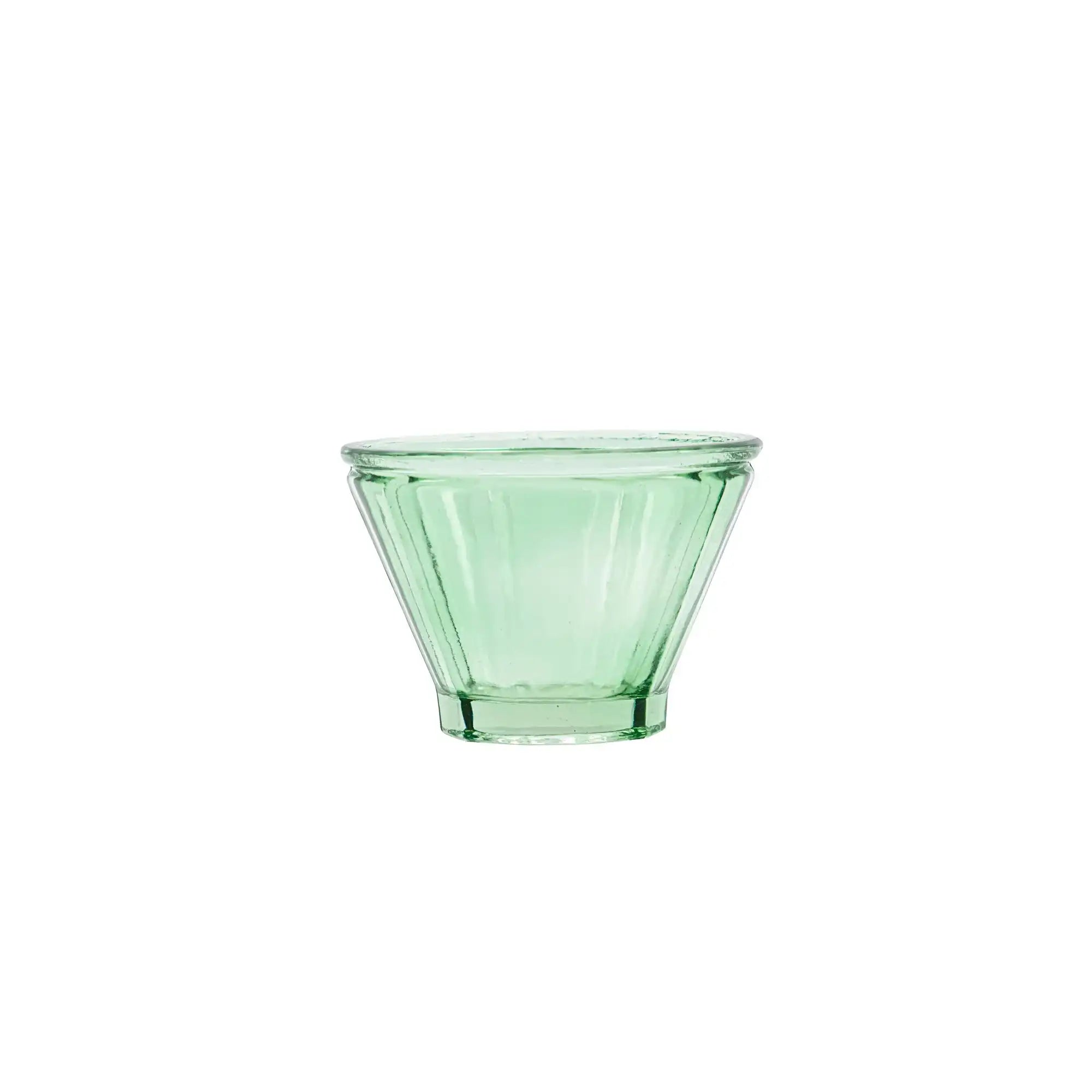 Dieser robuste Teelichthalter ist handgefertigt aus schwerem grünem Glas, das trotz seines Gewichts luftig wirkt. Die geriffelte Oberfläche fängt das Kerzenlicht wunderschön ein und sorgt für ein stimmungsvolles Spiel aus Schatten und Glanz. Fren ist 7 cm hoch und hat einen Durchmesser von 10 cm – genau die richtige Größe, um dezent auf dem Tisch, einem Regal oder einer Kommode aufzufallen.