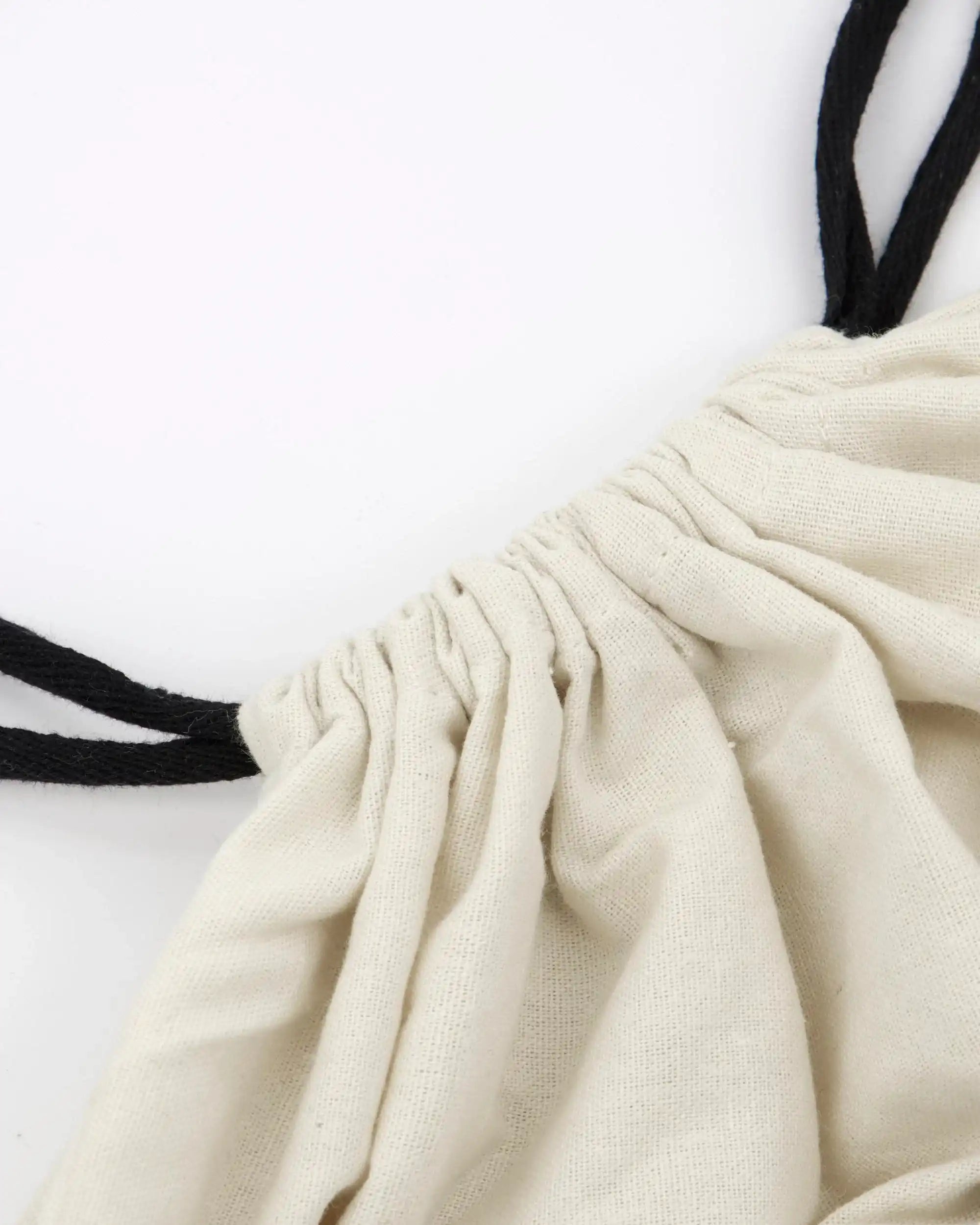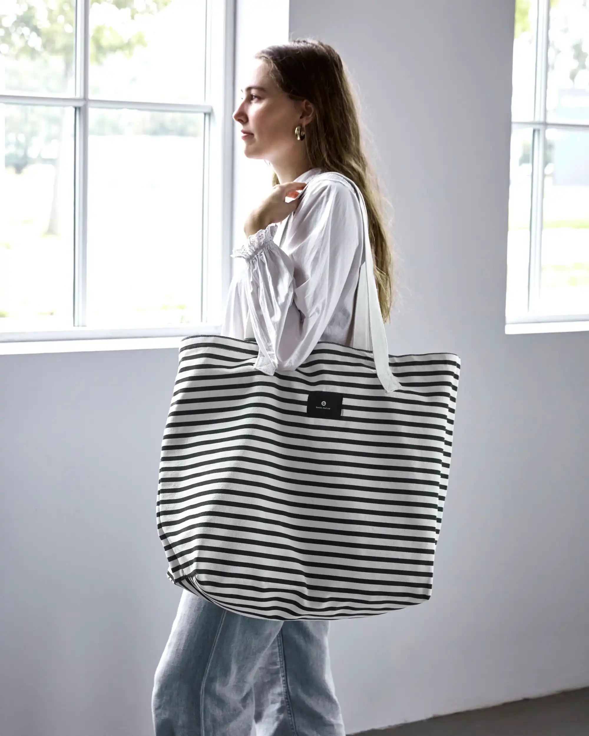 Die Tasche ist mit Sorgfalt handgefertigt und besteht aus einer robusten Mischung aus Baumwolle und Polyester. Die großzügigen Maße (l: 65 cm, h: 45 cm, t: 20 cm) machen sie zur praktischen Wahl für alle, die gerne etwas mehr Platz haben. Die schwarzen Streifen verleihen dem Design Charakter, während der Kordelzugverschluss dem Ganzen einen verspielten Akzent gibt.