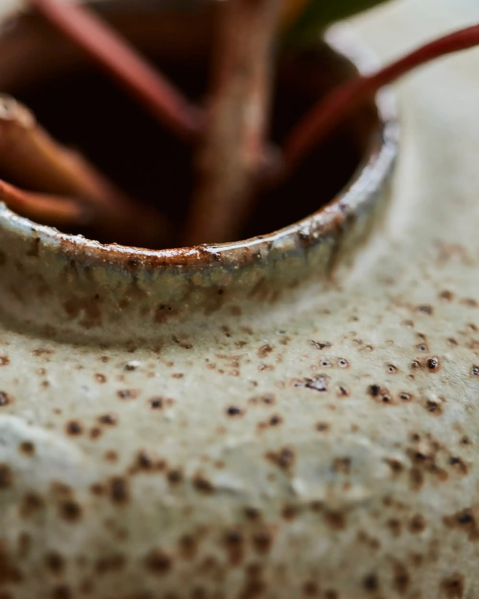 Gefertigt aus Keramik mit einer sanften, gräulichen Glasur fühlt sich die Vase natürlich und zugleich modern an. Die Vase ist 9 cm hoch und hat einen Durchmesser von 9,5 cm – kompakt genug für kleinere Sträuße, frisch gepflückte Blumen oder einfach als stilvolles, ruhiges Objekt auf einem Regal oder der Fensterbank.