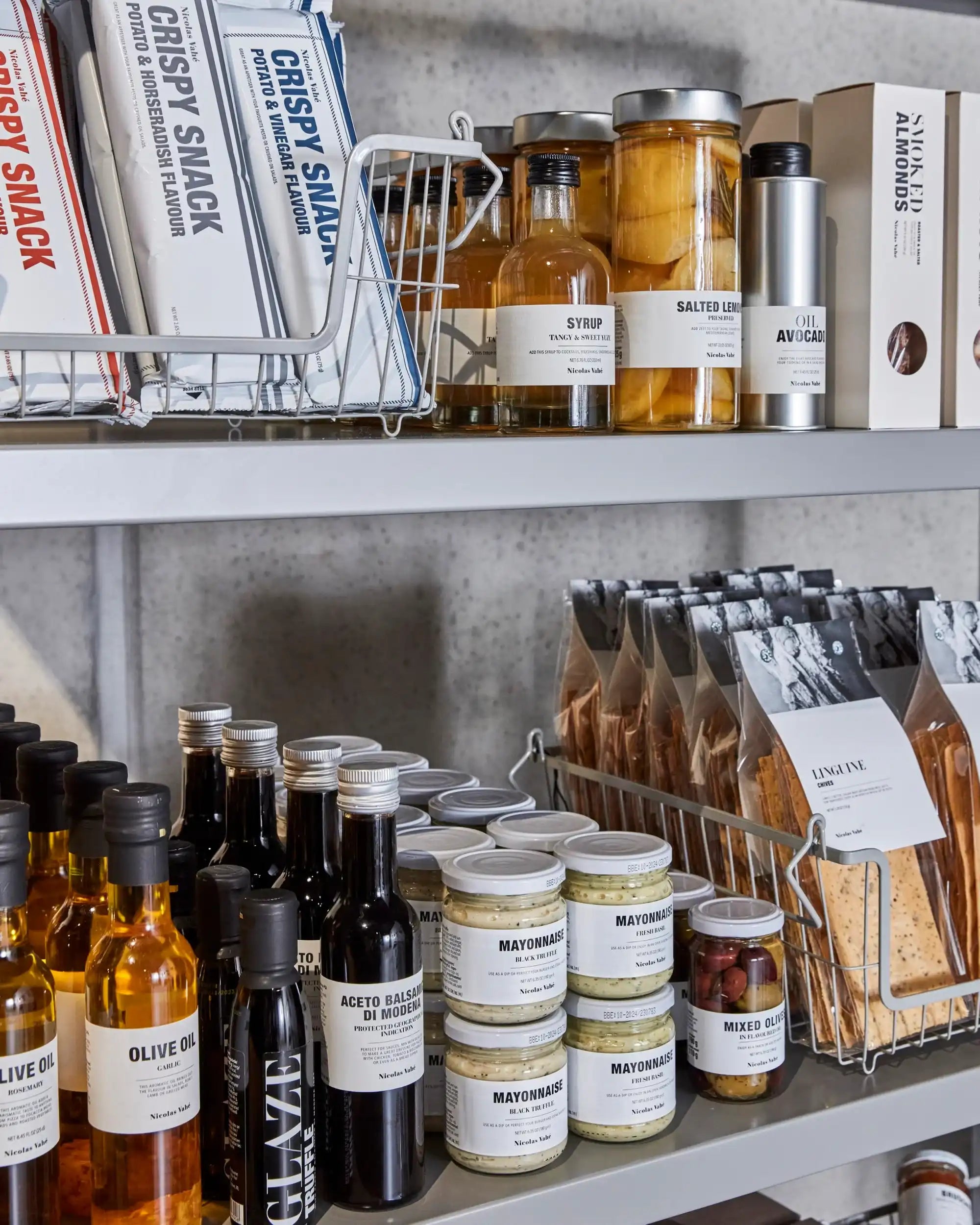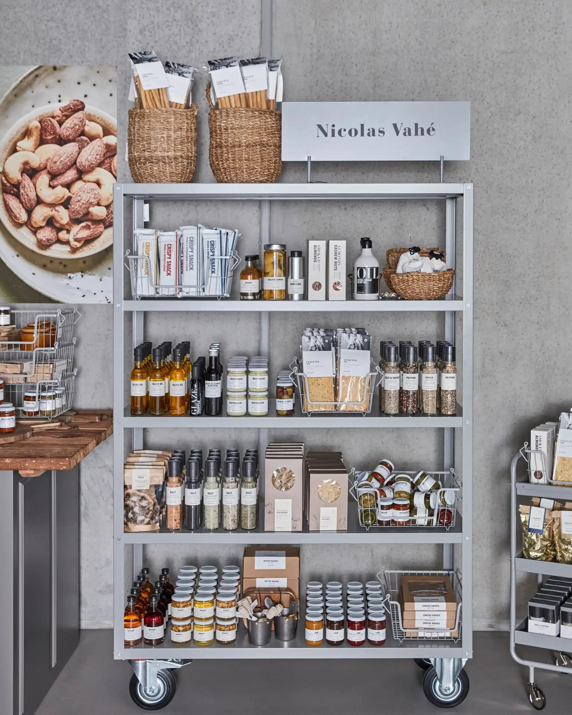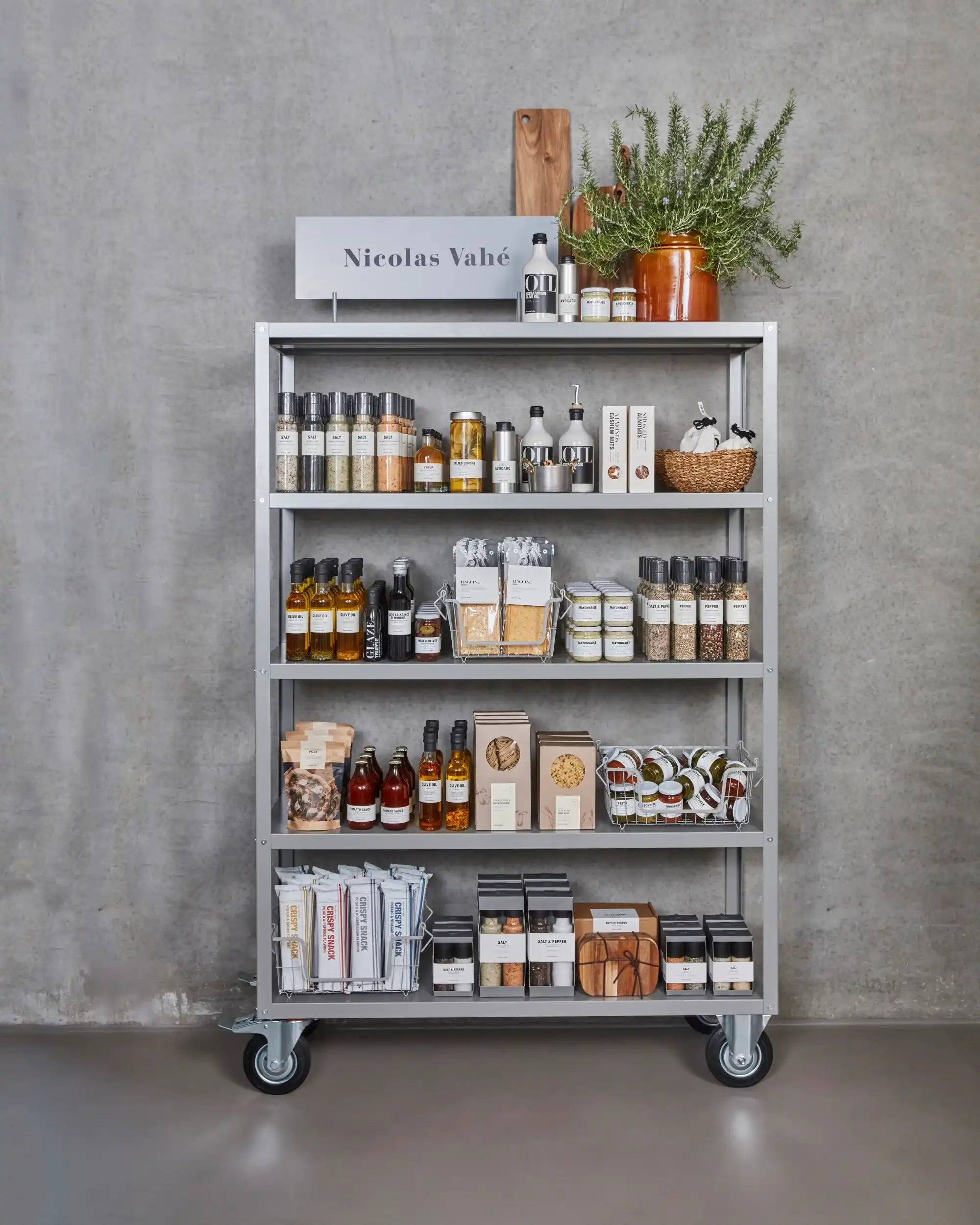 Das Regal ist in einem dezenten Grauton gehalten und aus einem robusten Material gefertigt, das zum rauen Charakter von Nicolas Vahé passt. Mit seinen Maßen von 120 cm Länge, 45 cm Breite und 180 cm Höhe bietet es großzügige Aufbewahrungsmöglichkeiten, ohne wuchtig zu wirken. Dank der vier Rollen lässt es sich leicht verschieben – praktisch beim Putzen oder Umgestalten.