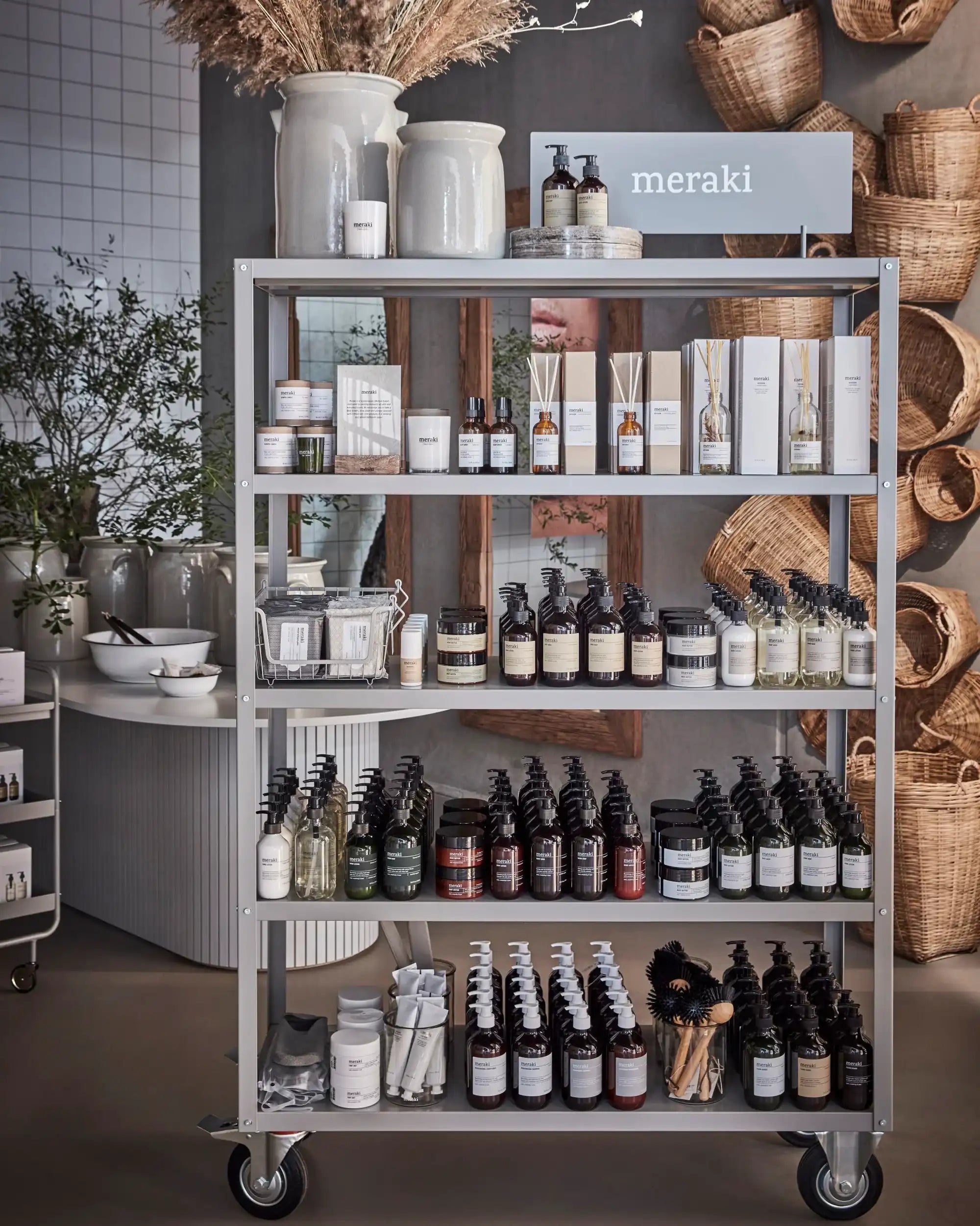 Der Trolley ist 120 cm lang, 45 cm breit und 180 cm hoch. Gefertigt aus robustem Material und in dezentem Grau gehalten, bietet er fünf großzügige Regalböden auf Rollen. Das ist das größte Aufbewahrungsmöbel von Meraki – ideal, um Atmosphäre und Übersicht in größeren Räumen oder kreativen Studios zu schaffen.