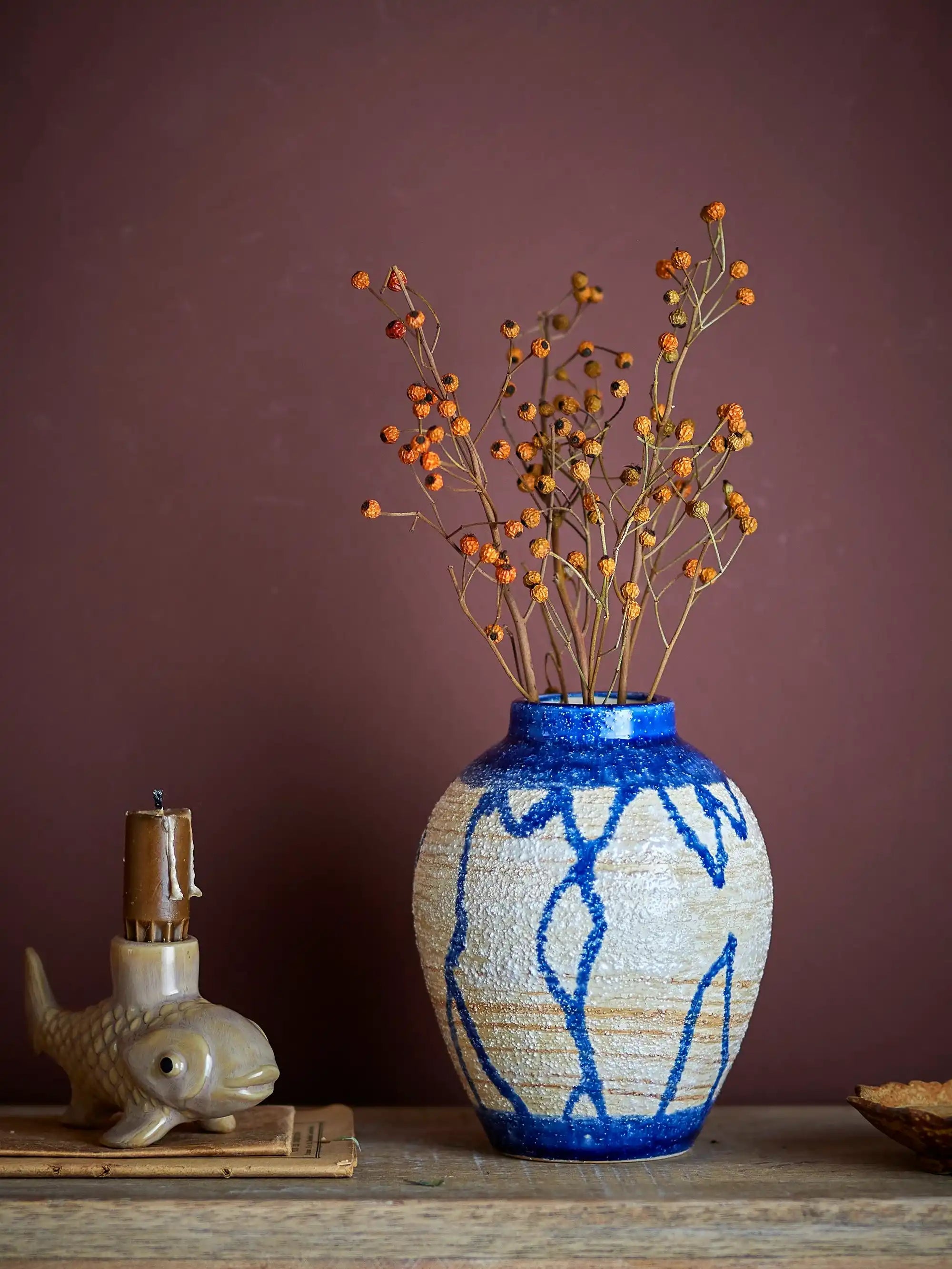 Details & Material: Die Vase besteht aus Steingut und zeigt reiche, kobaltblaue Muster, die wunderschön mit dem cremeweißen Untergrund kontrastieren. Mit ø 12 cm und 16 cm Höhe ist das Format kompakt und lässt sich leicht platzieren, ohne an Präsenz zu verlieren. Die organischen Rundungen fangen das Licht schön ein, während die leicht raue Textur für das gewisse Etwas sorgt. Das Ergebnis ist ein zeitloses Stück, das sich mühelos mit hellem Holz, Sandtönen und anderen natürlichen Materialien kombinieren lässt.