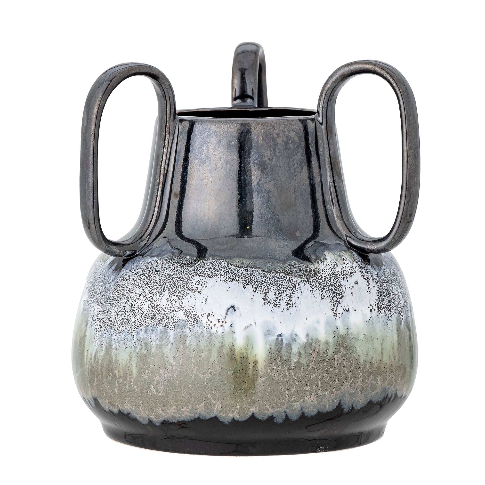 Details & Material: Die Vase besteht aus Steingut und ist mit reaktiver Glasur in dunklen Schwarztönen veredelt. Das Format ø 18 cm bietet ausreichend Platz für einige Stiele, ohne dass das Gesamtbild zu schwer wirkt – ideal für dezente florale Akzente. Die kleinen Henkel betonen die runde Form und sorgen für zusätzlichen Halt beim Umstellen. Die Glanzvariationen verleihen deinem Interieur Tiefe und Charakter.