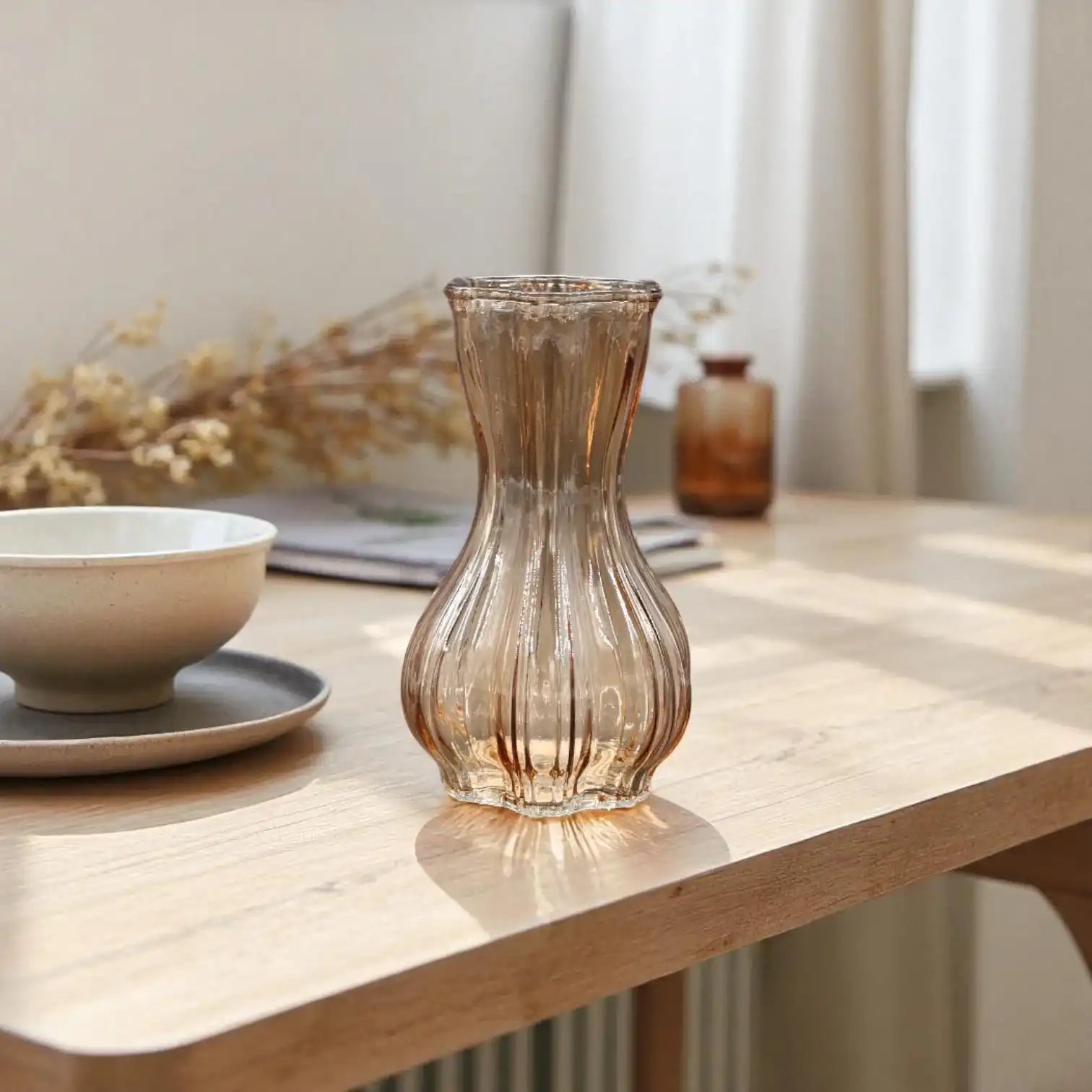 Dekotipp: Kombiniere die beige Flin Fion Vase mit Glas-Accessoires in grünen oder bernsteinfarbenen Tönen für einen harmonischen, natürlichen Look.Material: Glas