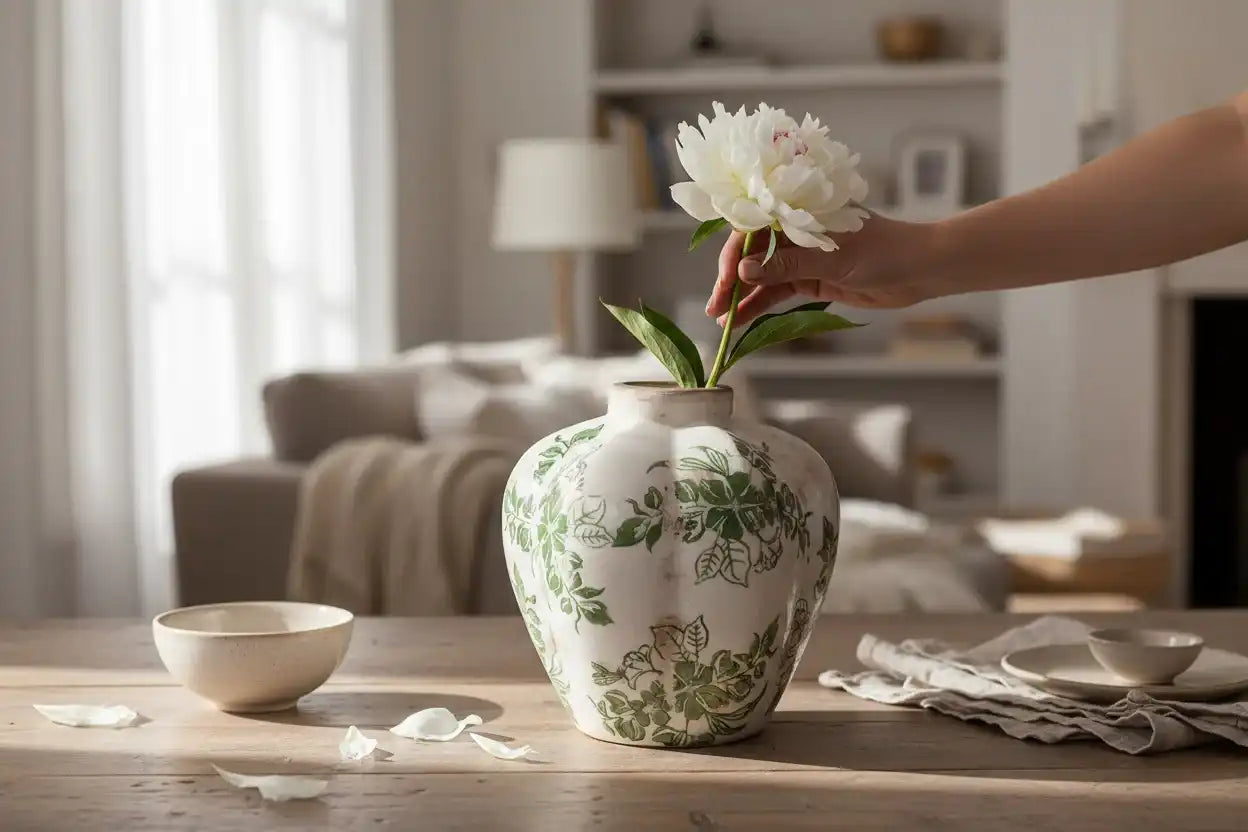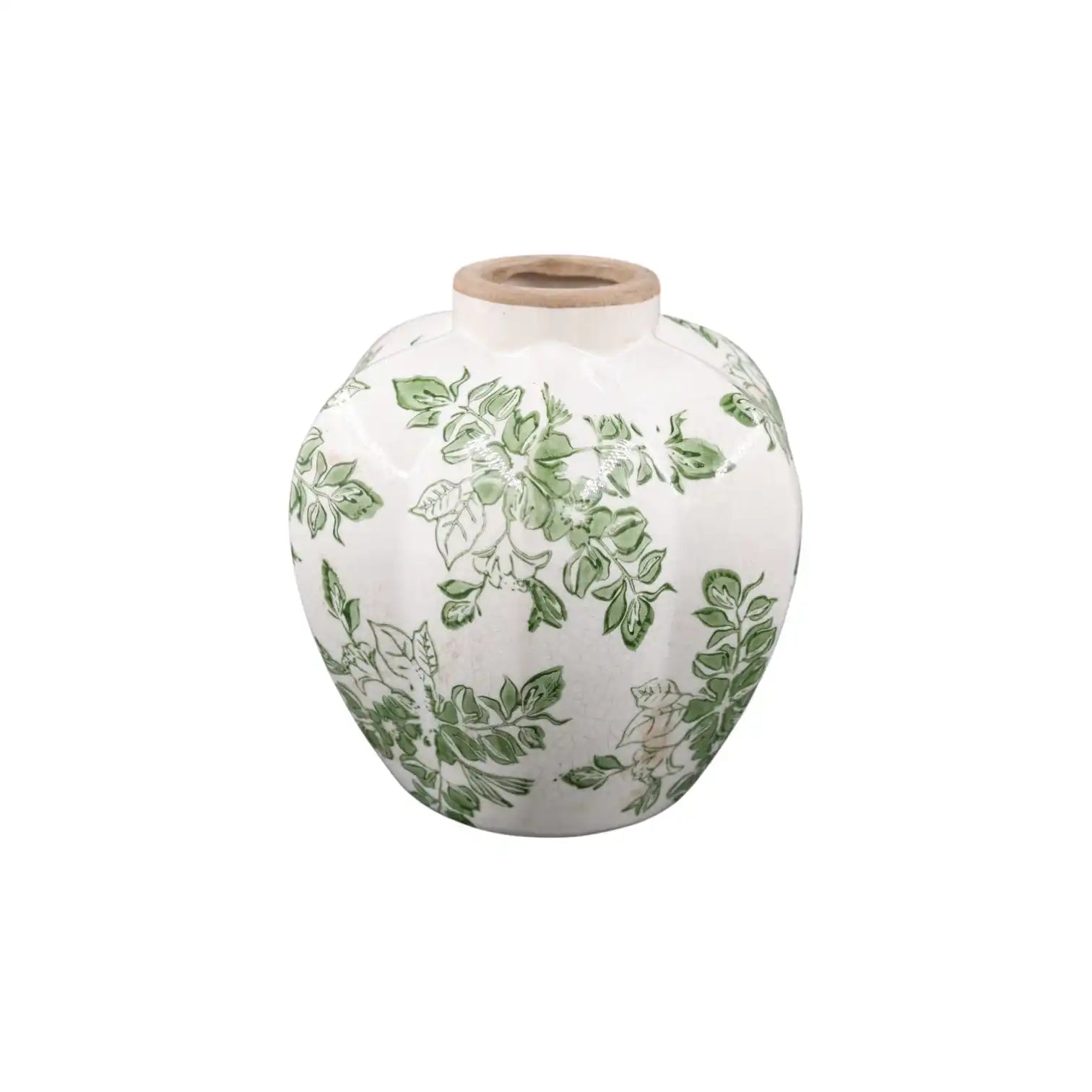 Die Vase Jona im großen Format vereint handwerkliches Können mit einer eleganten, charaktervollen Ausstrahlung. Mit ihrer dezenten Craquelé-Glasur und dem handbemalten Blattmotiv in frischen Grüntönen versprüht diese Vase den Charme eines alten Ateliers. Die natürlichen Unregelmäßigkeiten in Glasur und Farbe sorgen für einen authentischen, Vintage-Look.
