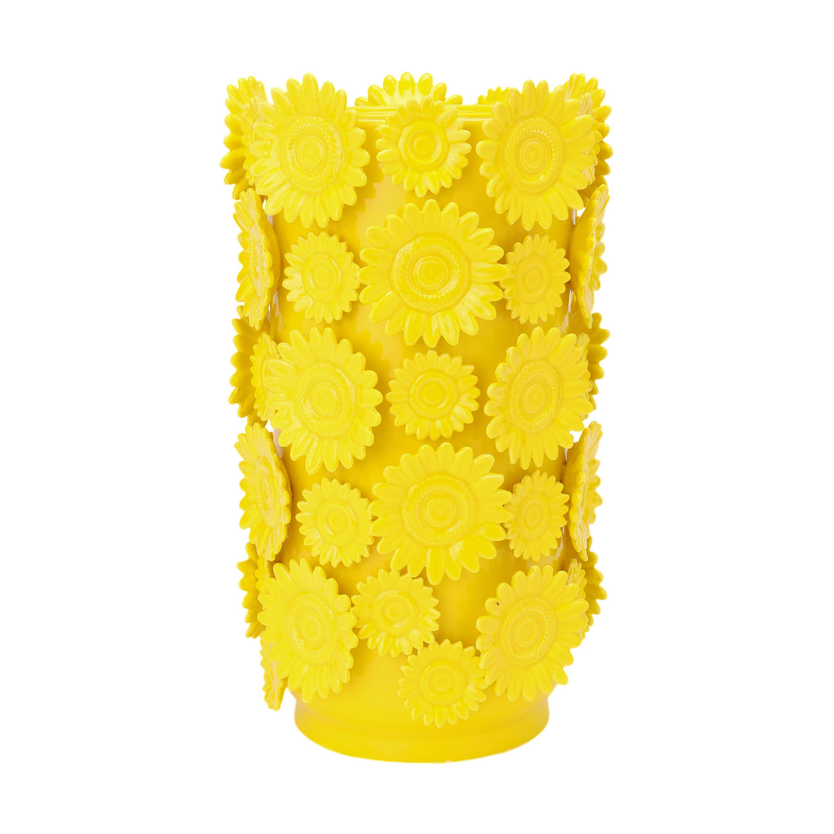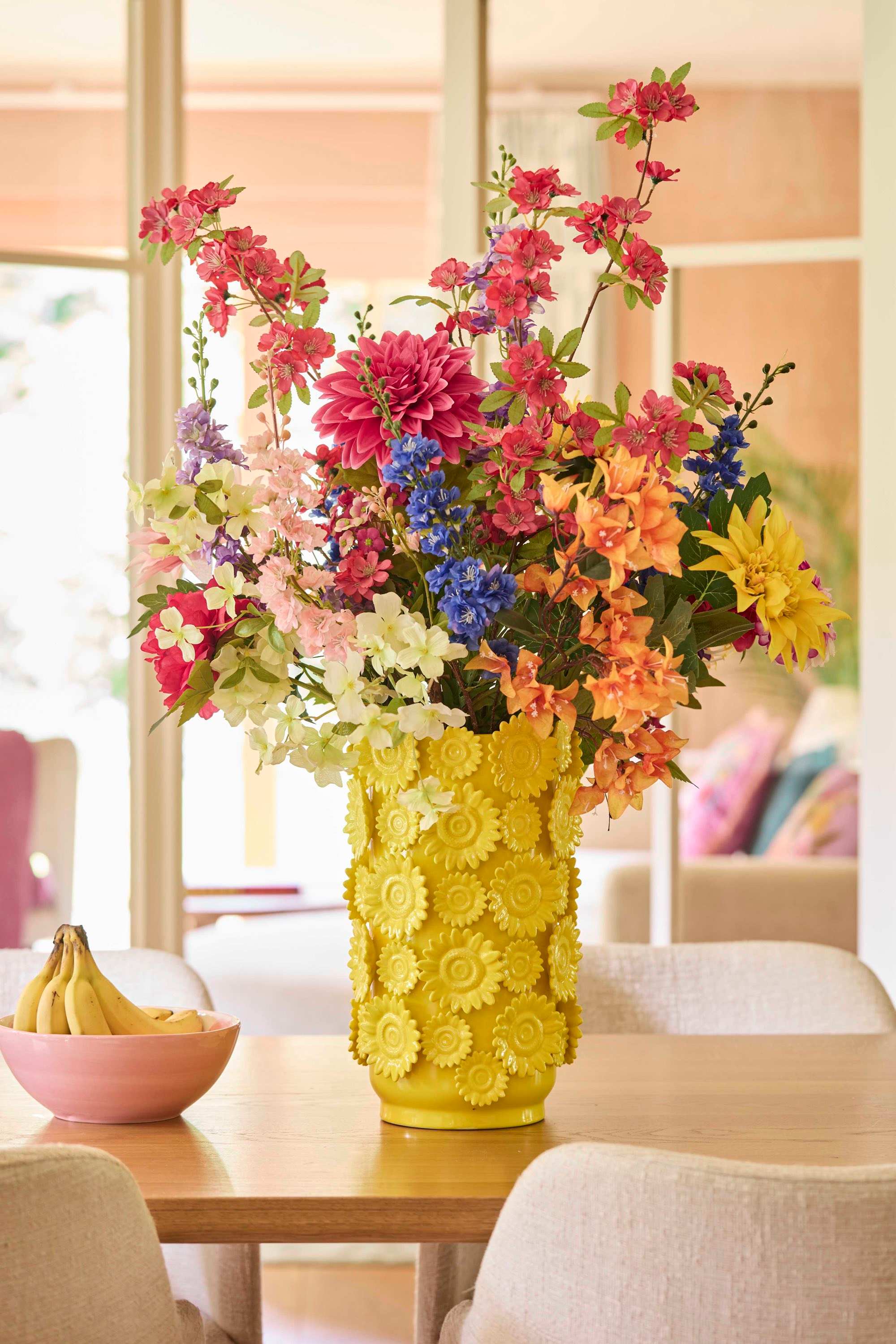 Sonne im Rampenlicht! Mit der Vase Sunny Side Up XL von House of Nature holst du dir garantiert eine große Portion Fröhlichkeit ins Haus. Diese große gelbe Vase besteht aus robustem Steingut und ist rundum mit einer bunten Mischung aus kleinen und größeren Sonnenblumen verziert, die wie spielerisch aufgeklebt wirken. Ein echter Blickfang – egal, ob du sie für einen Strauß Trockenblumen, Kunstzweige oder einfach als dekoratives Statement verwendest.