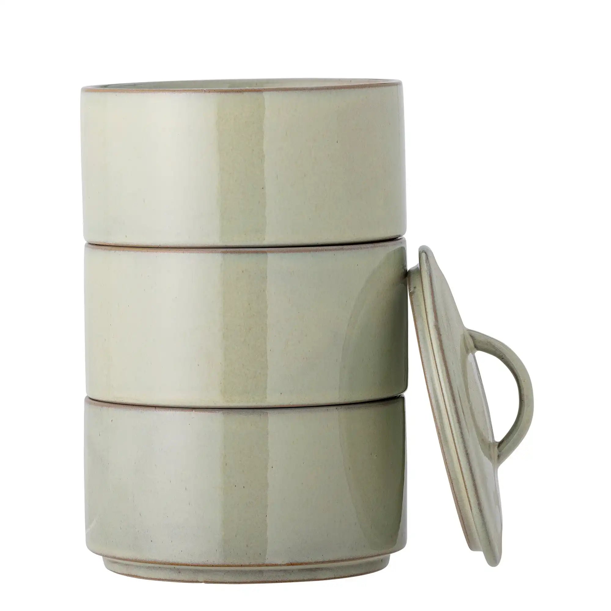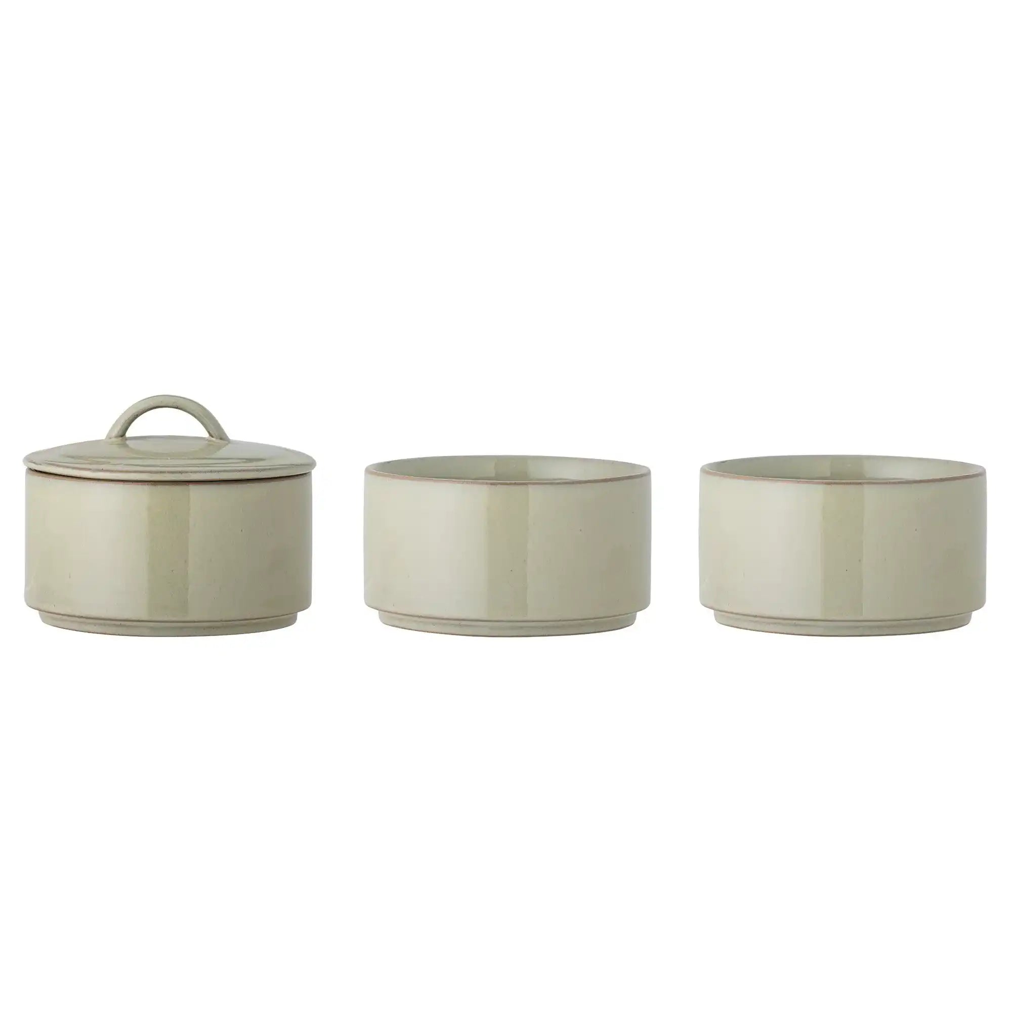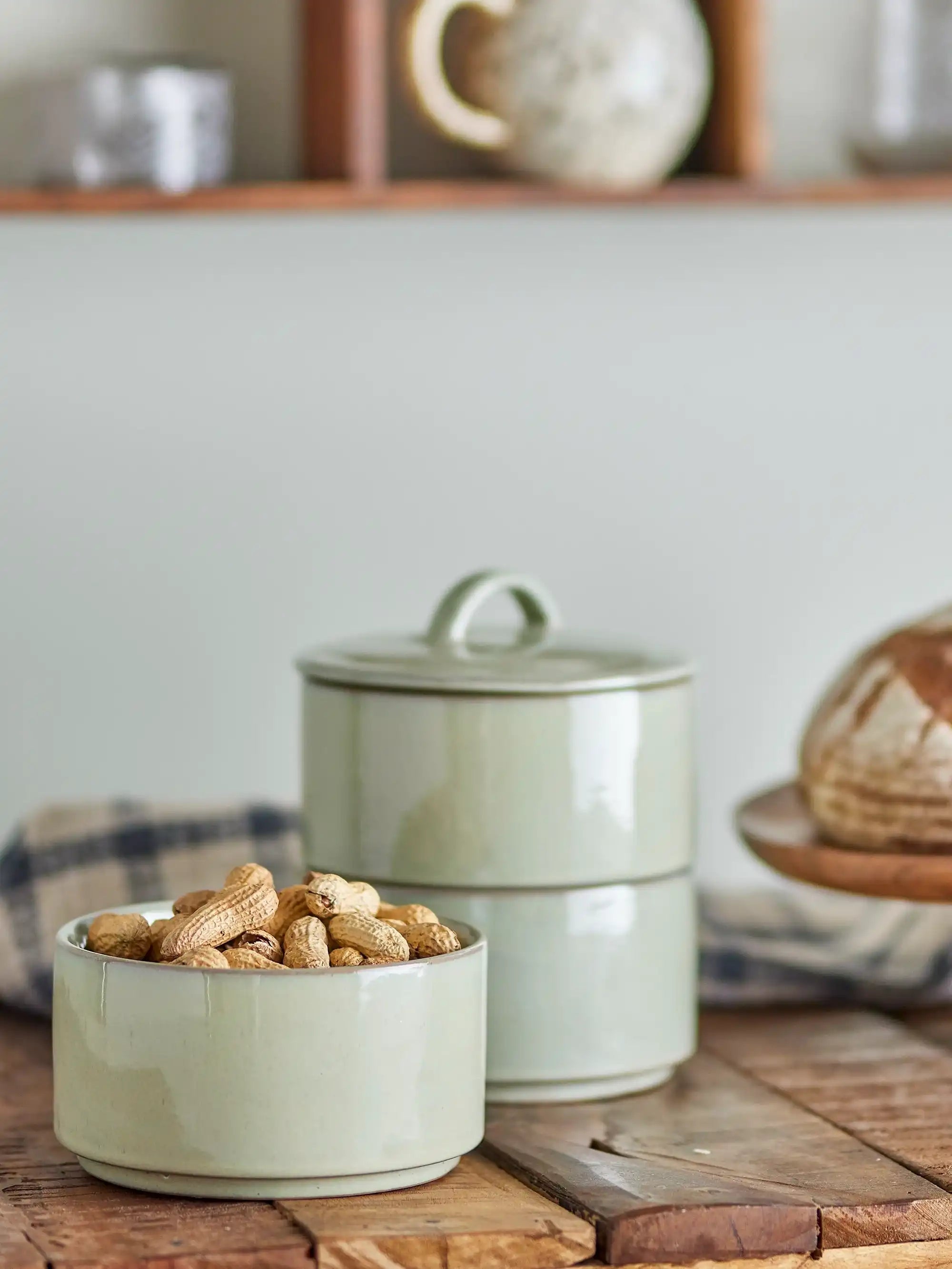 Die Ebba ist sowohl schön als auch funktional. Das Set besteht aus drei Schalen, die du übereinander stapelst und mit einem Deckel verschließt. So sorgst du für Ordnung auf der Arbeitsfläche und kannst beim Servieren trotzdem schnell variieren. Die sanfte grüne Glasur verleiht deinem Tisch eine ruhige, skandinavische Ausstrahlung und lässt Speisen besonders schön wirken. Ob Nüsse, Dips oder kleine Snacks: Mit Ebba sieht alles gepflegt aus und ist immer griffbereit.