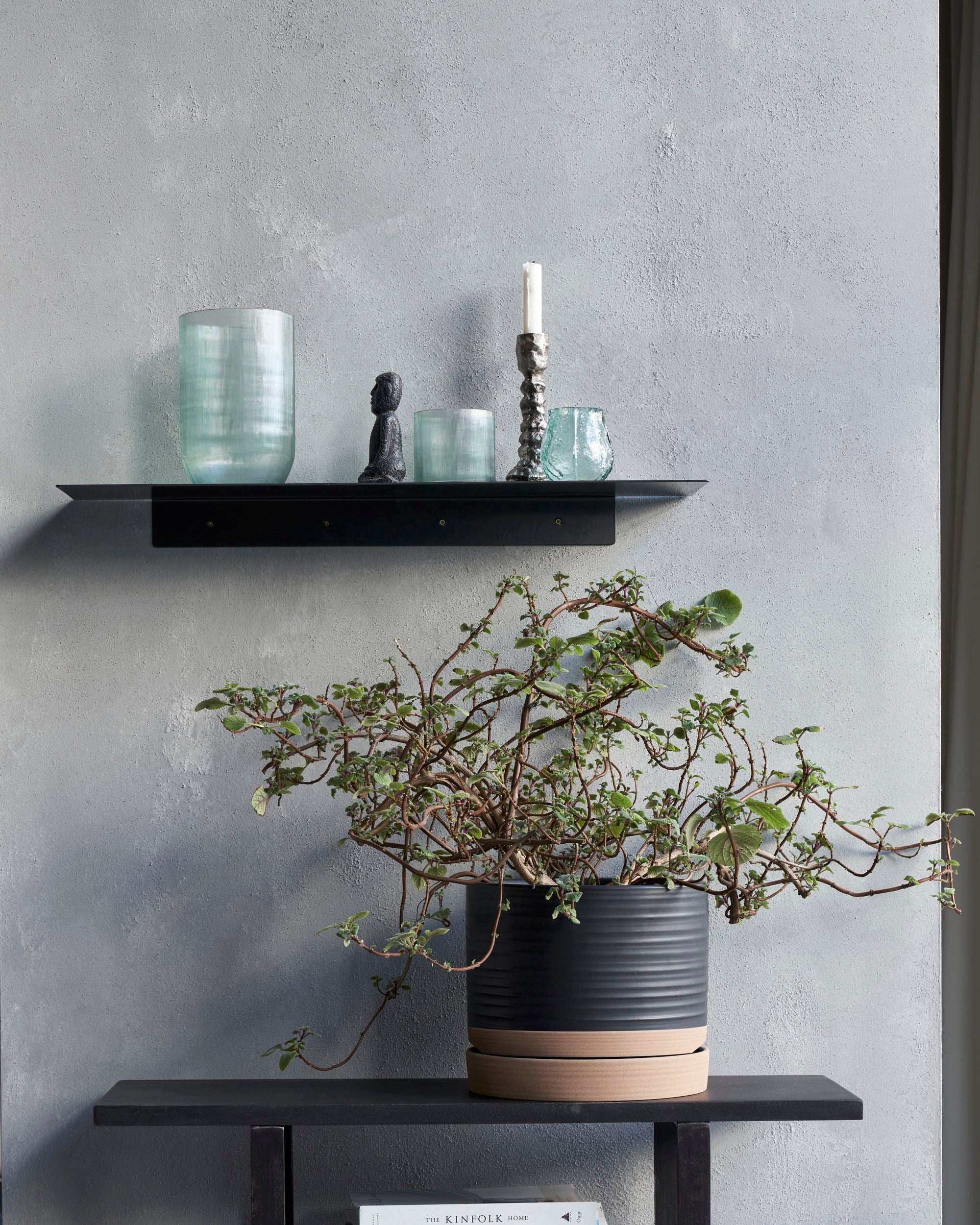 Revi besteht aus schwarzem Metall und bietet mit seiner großzügigen Länge von 80 cm ausreichend Platz für dekorative Accessoires oder eine kleine Büchersammlung. Das Regal ist 20 cm breit und 6,5 cm hoch und kommt als einzelnes Element an der Wand besonders gut zur Geltung, lässt sich aber auch wunderbar mit mehreren Exemplaren kombinieren.