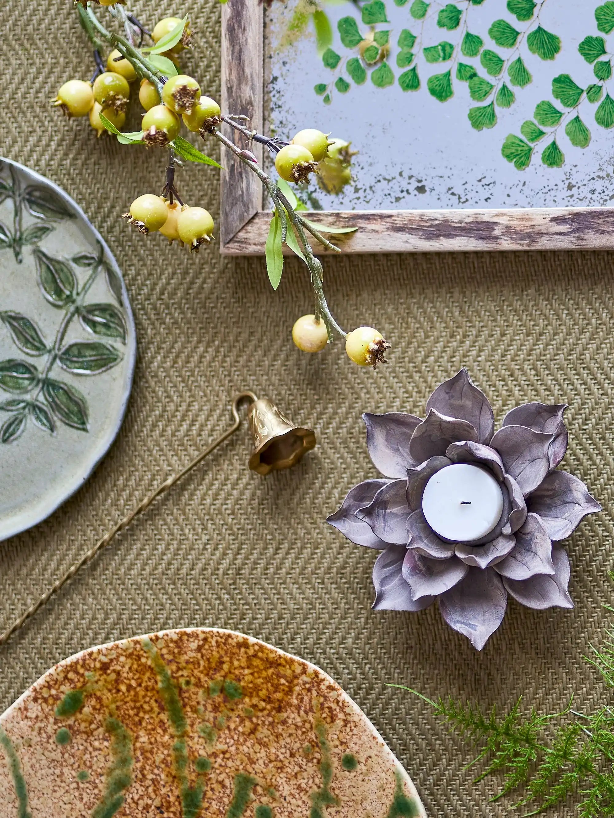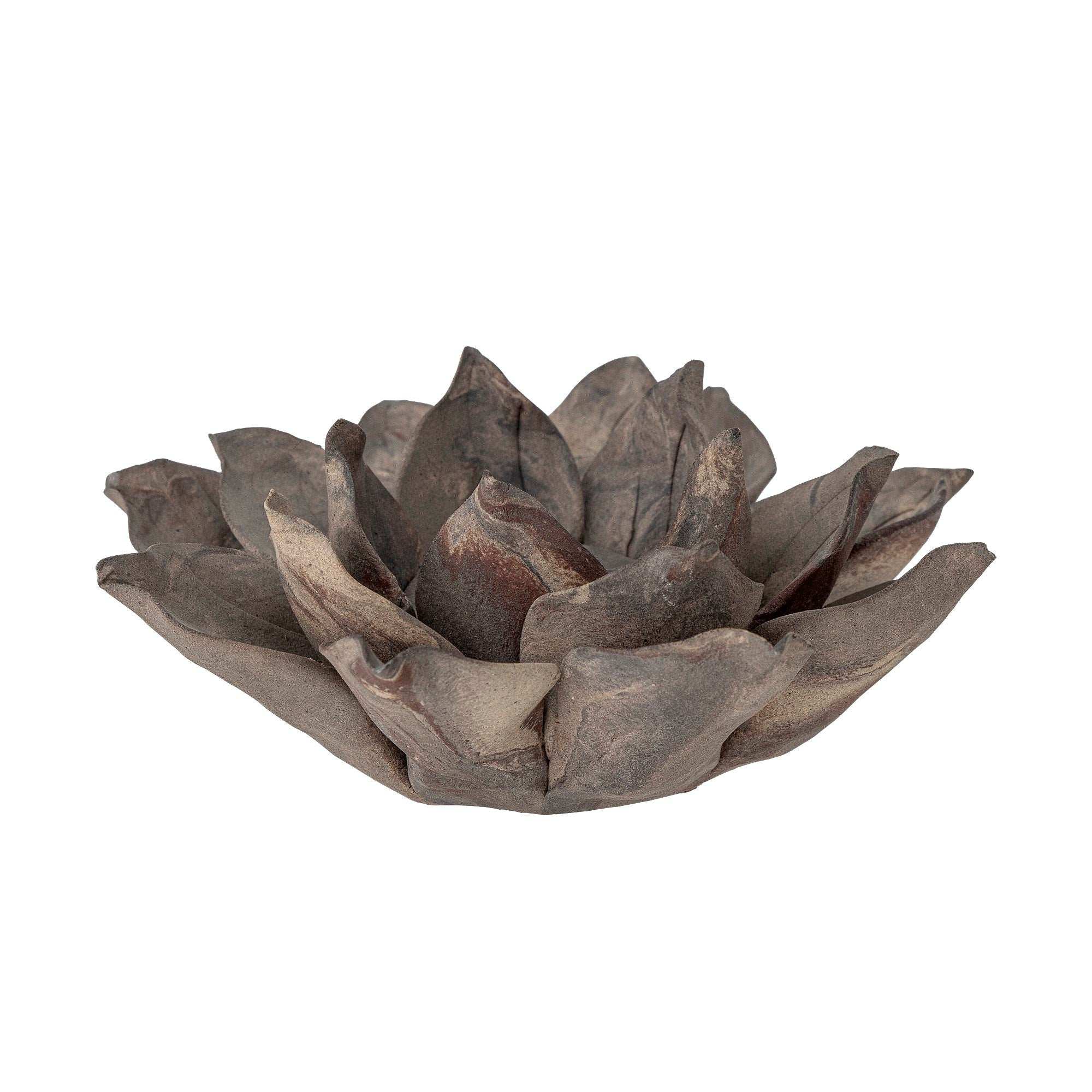 Details & Material: Eira ist aus braunem Steingut gefertigt und hat einen runden Durchmesser von ø 13 cm. Durch den handwerklichen Herstellungsprozess ist jeder Halter ein Unikat; subtile Unterschiede in Farbe und Form verleihen jedem Stück Charakter. Der blumenartige Rand rahmt das Teelicht ein und sorgt für einen organischen Look, der sich mühelos mit anderen Erdtönen und natürlichen Materialien kombinieren lässt. Die Form erinnert an eine blühende Blume und wirkt zugleich ruhig und raffiniert. Die abgerundeten Blätter bilden eine dezente Schale um den Lichtpunkt, was die Atmosphäre noch sanfter macht.