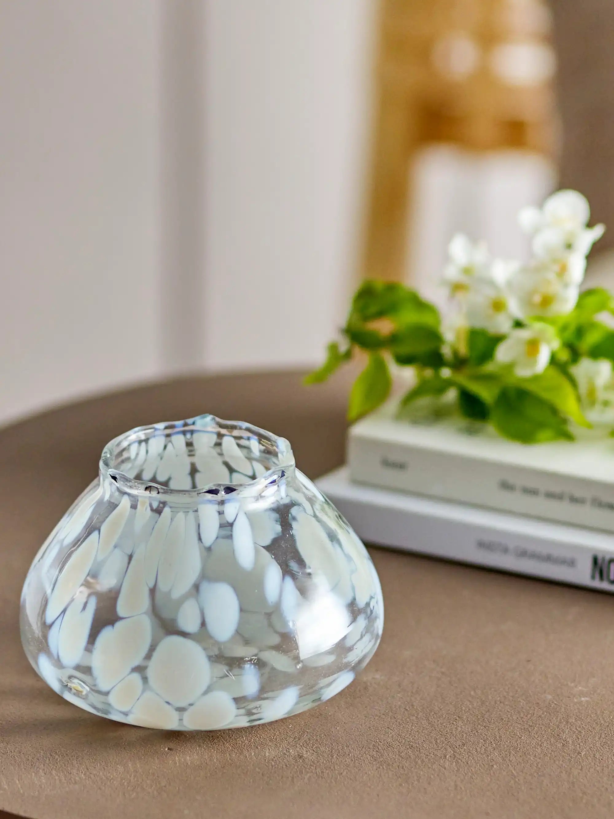 Details & Material: Dieser stilvolle Halter besteht aus hochwertigem Glas und hat eine elegante, organische Form mit einem Durchmesser von 12 cm und einer Höhe von 8,5 cm. Das dezente weiße Muster sorgt für stimmungsvolles Licht, sobald du ein Teelicht hineinstellst – ideal für alle, die moderne skandinavische Eleganz lieben.
