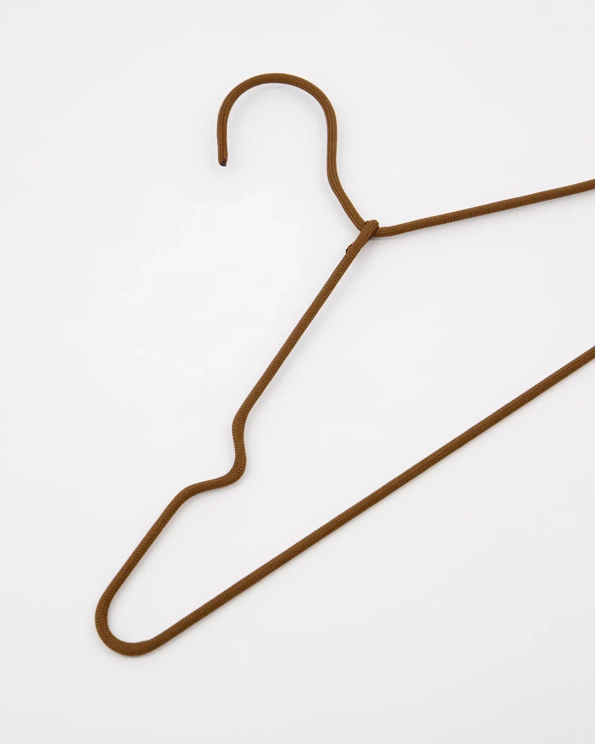 Die Kleiderbügel bestehen aus einem einzigen Stück Metall, das komplett mit einem klassischen braunen Nylonstoff überzogen ist. Dank der Einkerbungen an den Schultern bleiben Kleidungsstücke mit schmalen Trägern oder weiten Ausschnitten ordentlich an ihrem Platz. Mit ihren Maßen von 40,2 cm Länge und 20,8 cm Höhe passen sie perfekt in die meisten Standard-Schränke.