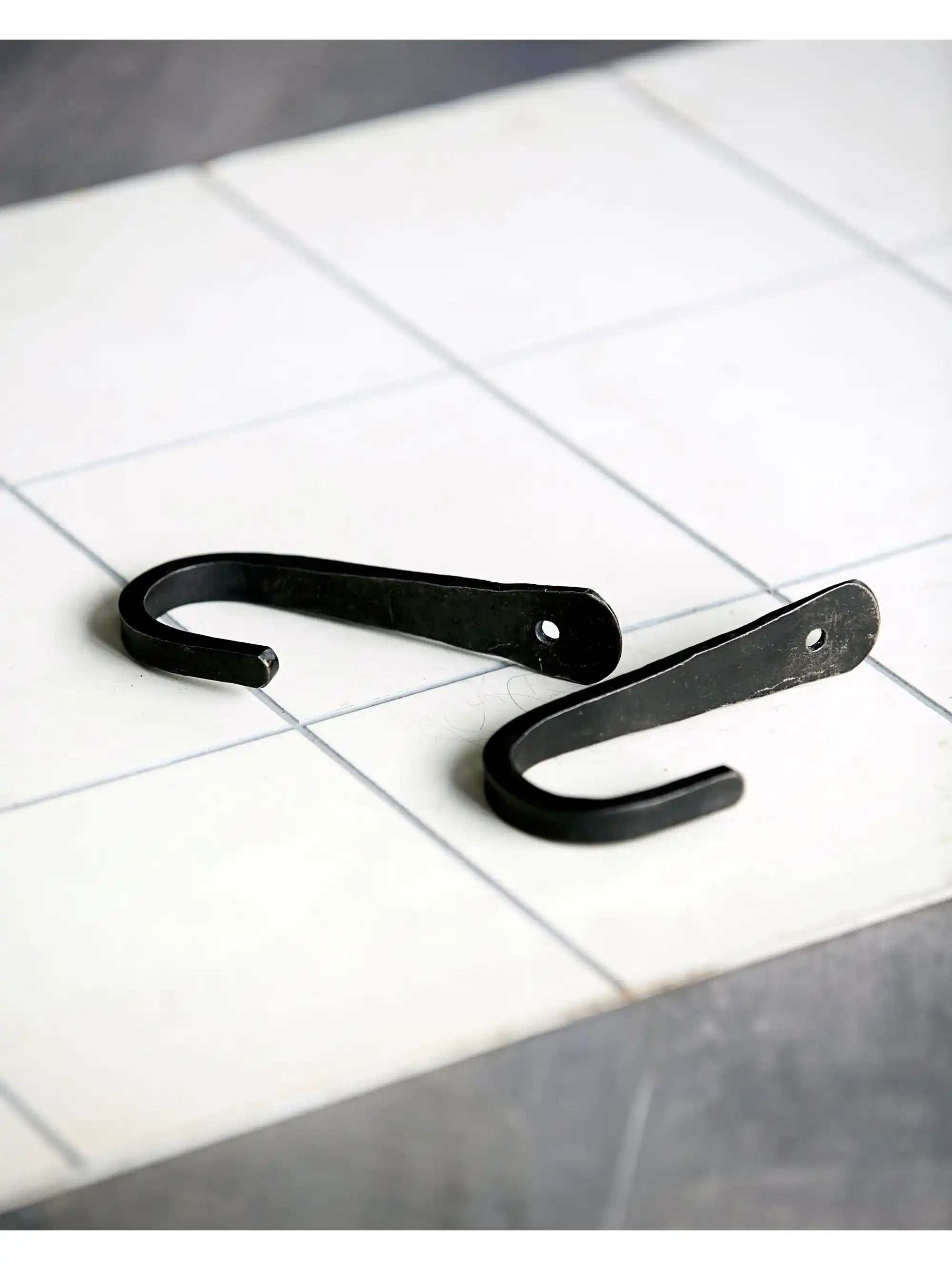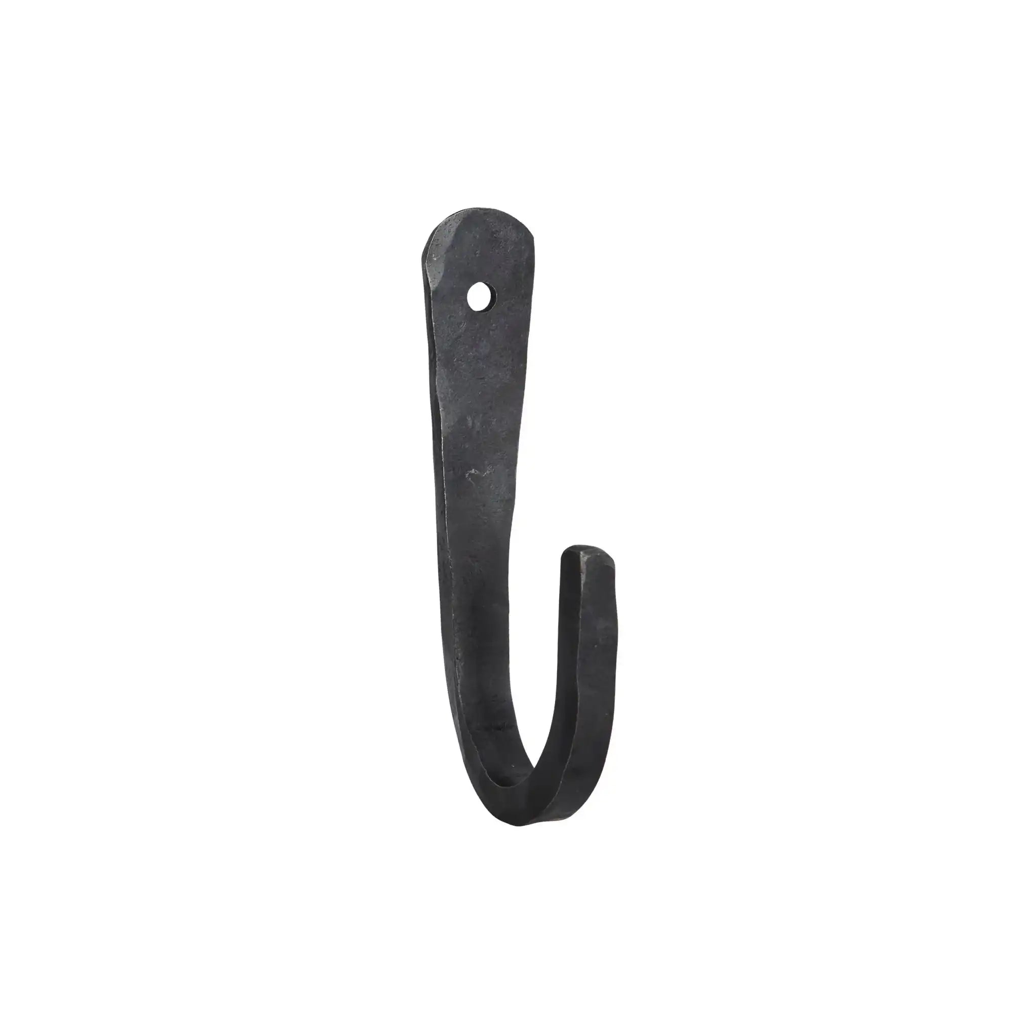 Der Haken besteht aus schwarz gefärbtem Metall und hat eine Tiefe von 13,5 cm. Dank seines robusten Designs bietet er einen stabilen Platz zum Aufhängen von Jacken, Taschen oder Schmuck. Das Material hat einen unbehandelten Charakter, der perfekt in ein modernes, warmes Interieur mit einer markanten Note passt.