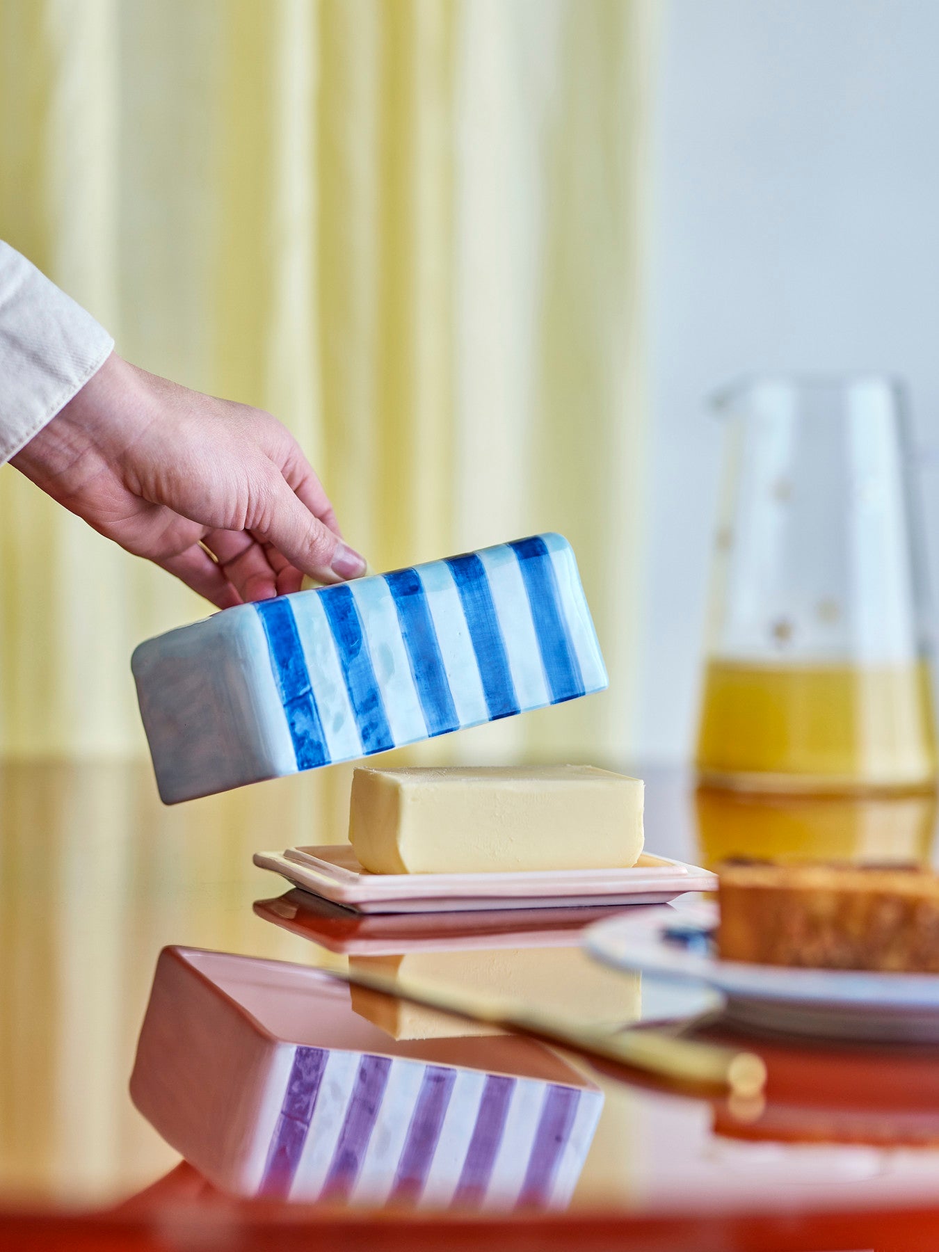 Why you’ll want this butter dish from Bloomingville: The Phoenix butter dish from Bloomingville brings calm to your breakfast habit. Your butter gets its own protected spot and is always ready on the table, without wrapping. The hand-painted striped pattern in contrasting shades adds a gentle touch of life, while the glossy finish catches the light beautifully. Thanks to the loop-shaped handle, you can lift the lid with ease, even with one hand. A small, thoughtful choice that makes your table look more cared for and makes spreading every day just that little bit nicer.