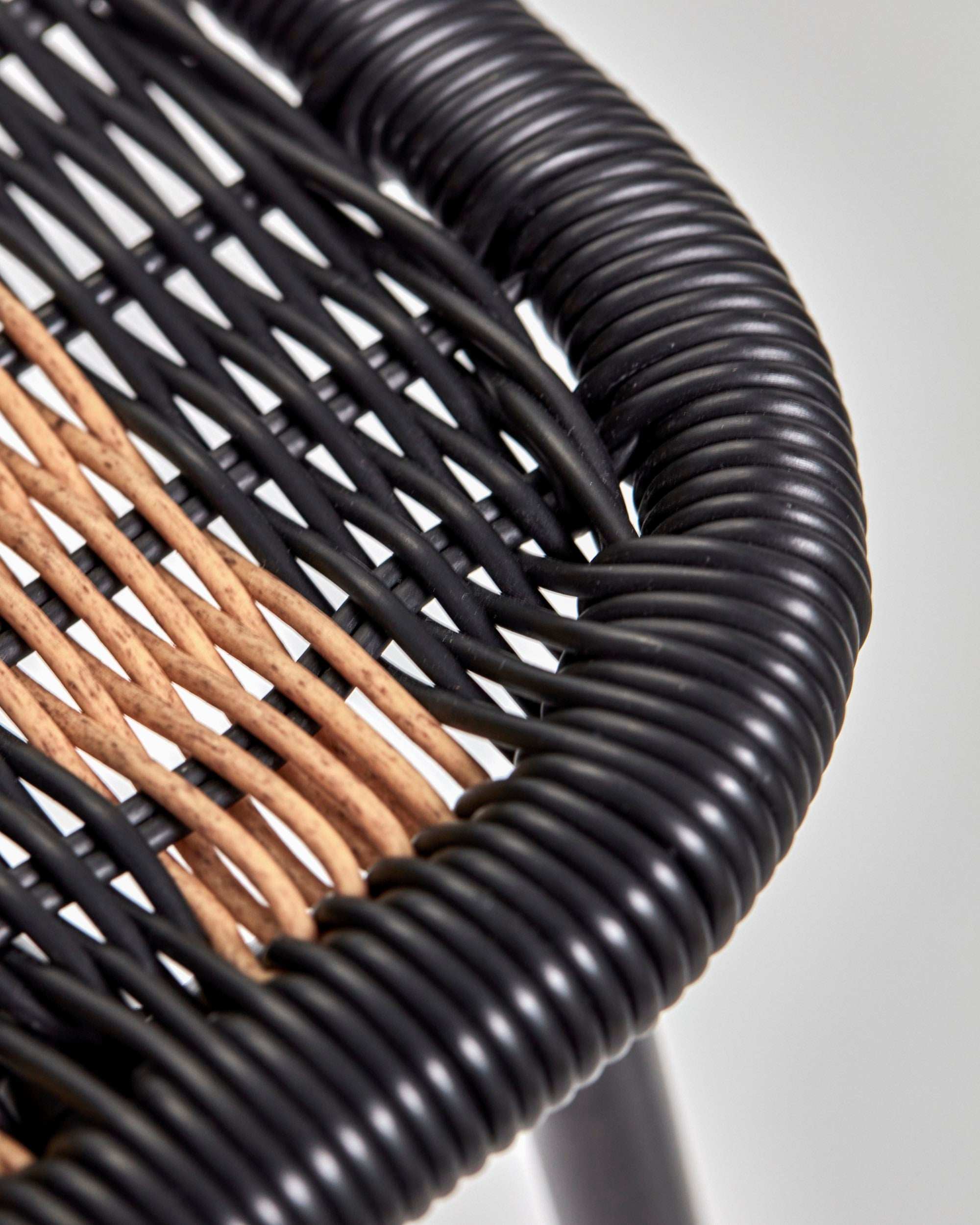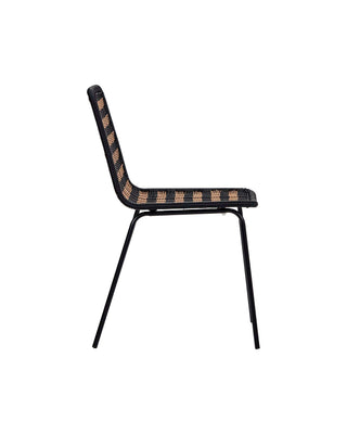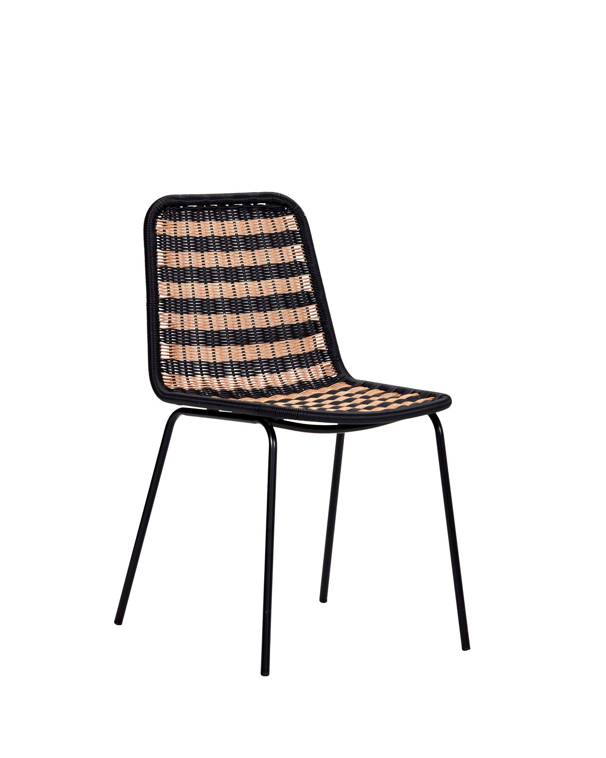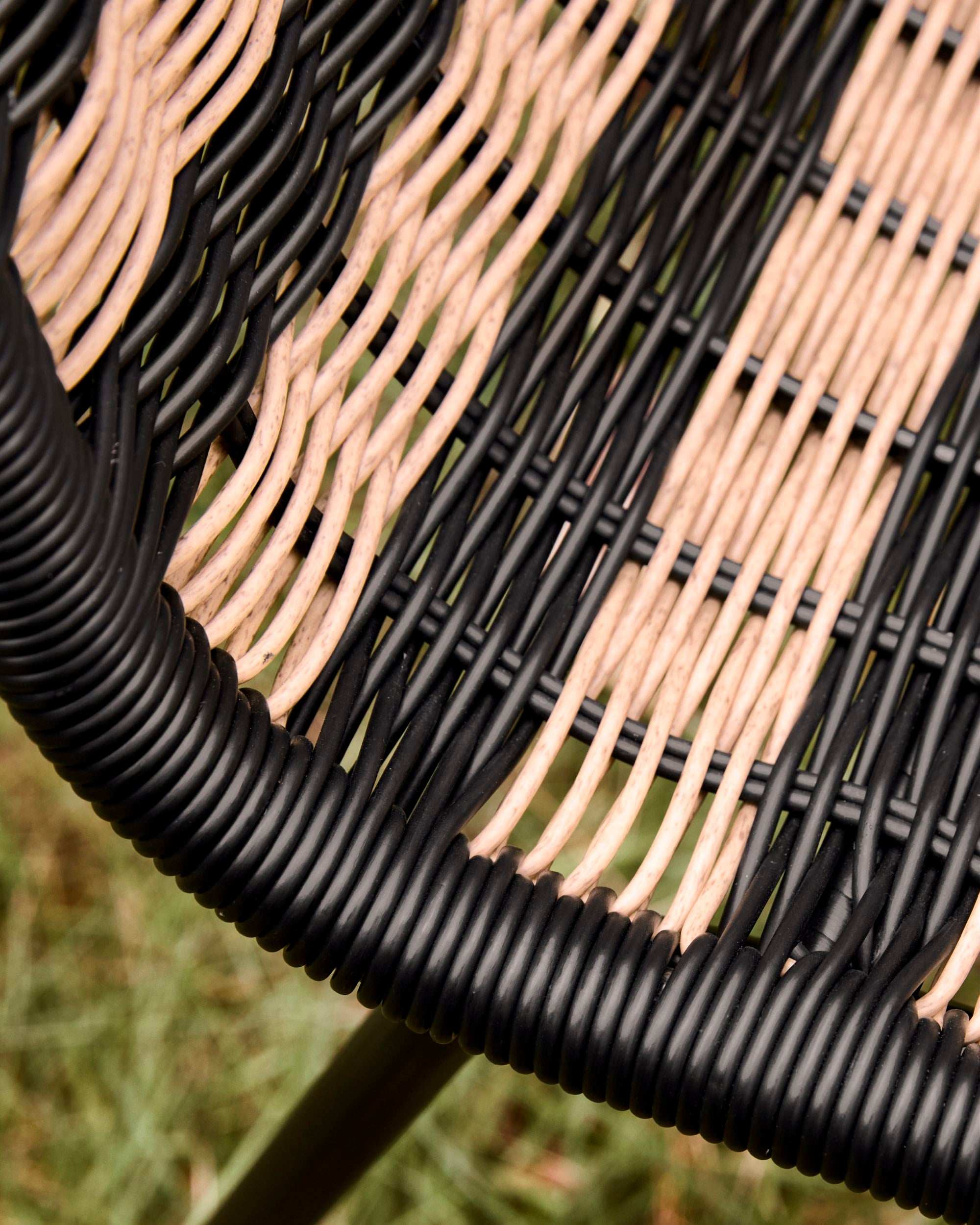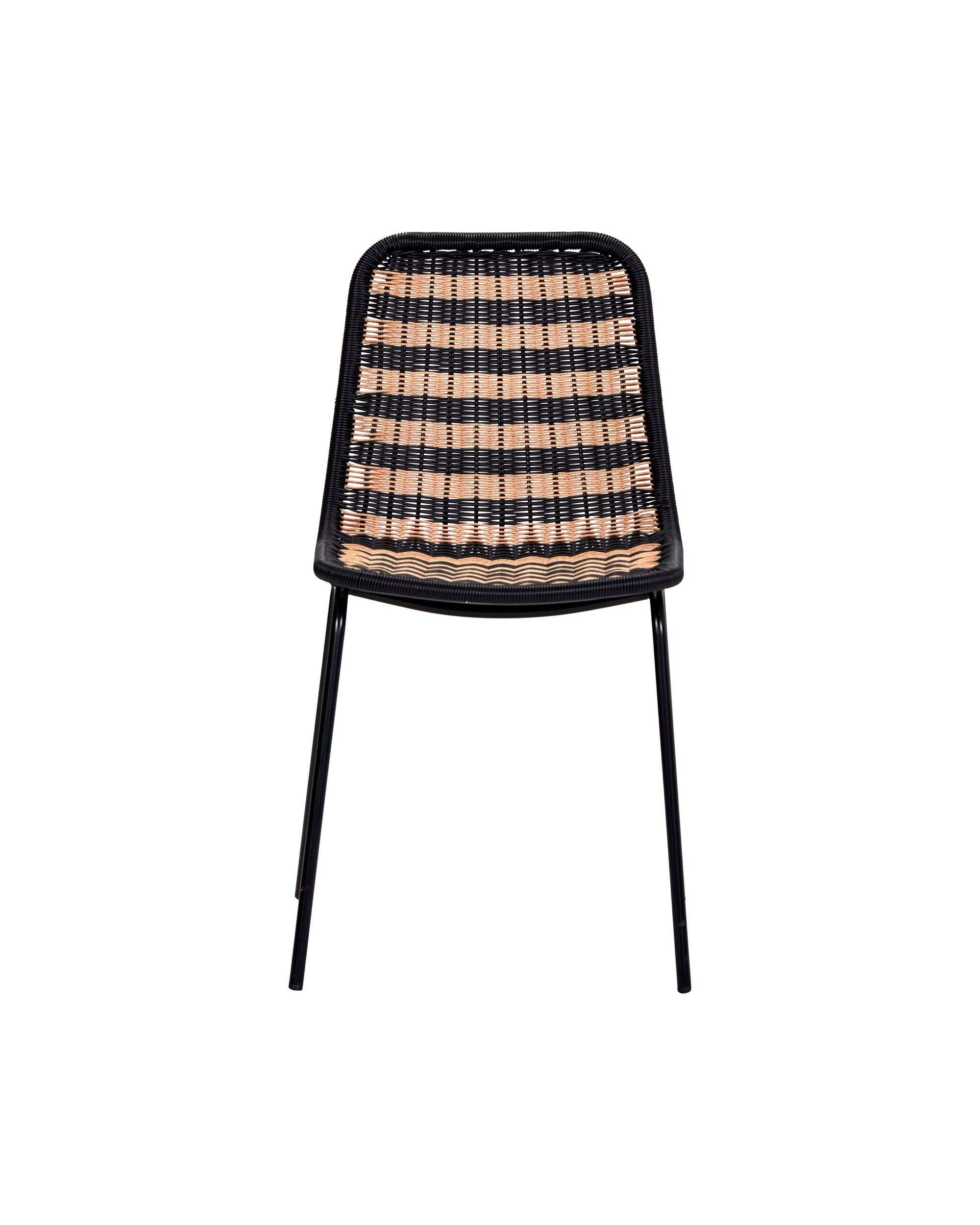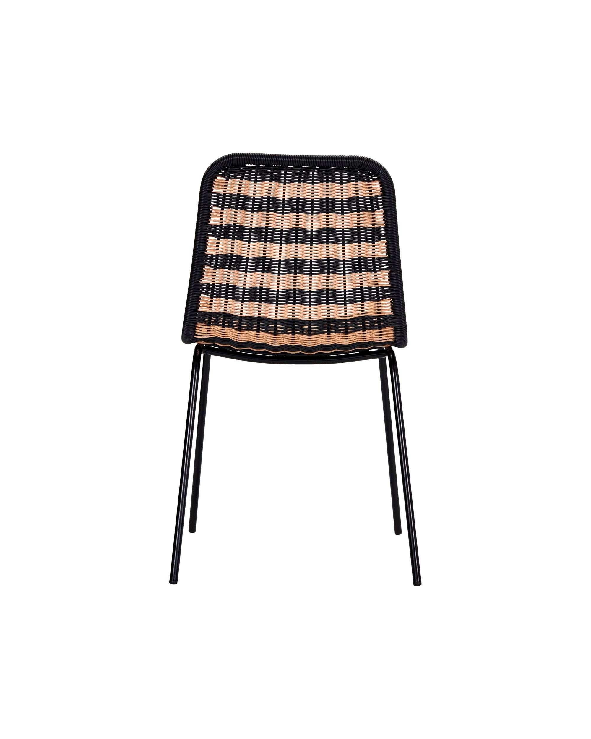 The design stands out due to the graphic pattern of the wickerwork, which gives the chair a subtle boho look with a modern twist. The slim metal legs in black powder-coated iron provide strength and stability, while the rounded edges provide comfort and a refined finish.