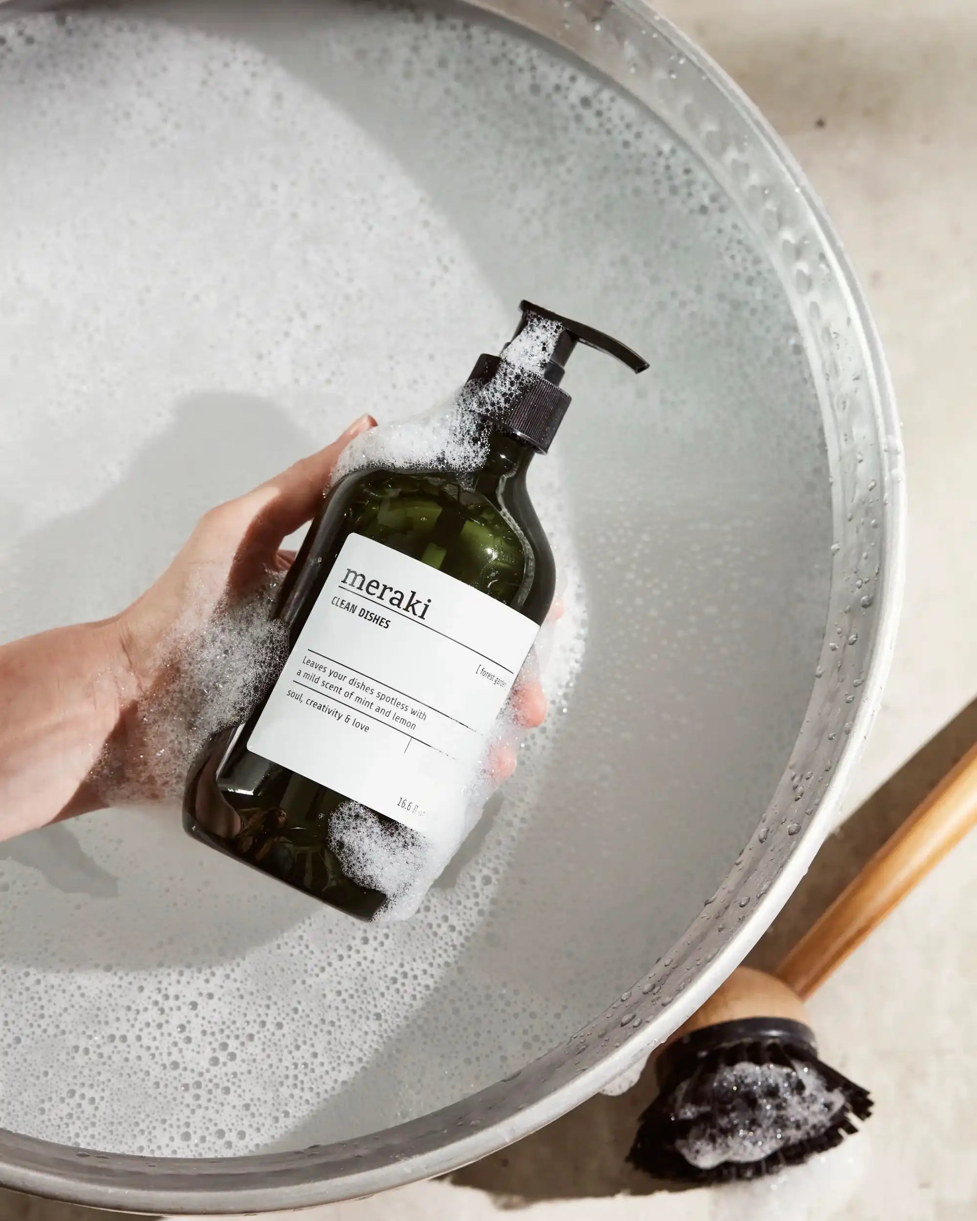 The dishwashing liquid in the Meraki Gift Box kitchen basics makes washing up easy and efficient. The mint and lemon scents provide a fresh dishwashing experience, while the powerful formula effortlessly removes dirt and grease. The anti-odour hand soap is an indispensable product in every kitchen, especially after preparing strong-smelling ingredients. The hand soap contains betaine, an ingredient known for its moisturising and skin-strengthening properties, leaving your hands not only clean but also soft.