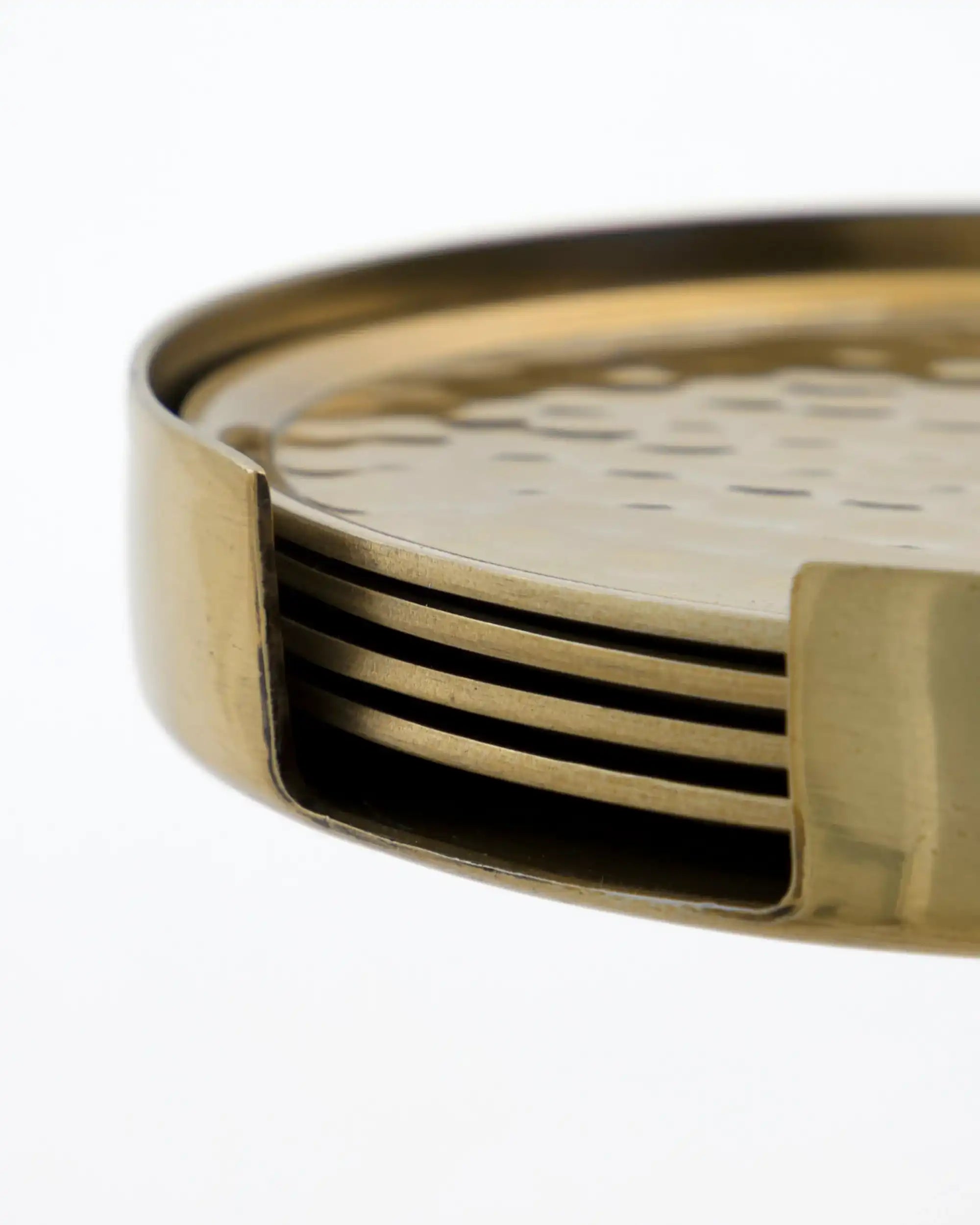 Give your table setting an instant touch of luxury with the Hammer Gold Coasters. This set of five coasters is handmade from high-quality aluminum and features a stylish hammered finish in a warm gold color. Thanks to their rounded shape and distinctive design, the coasters are perfect for any occasion, from a cozy drinks reception to a festive dinner.