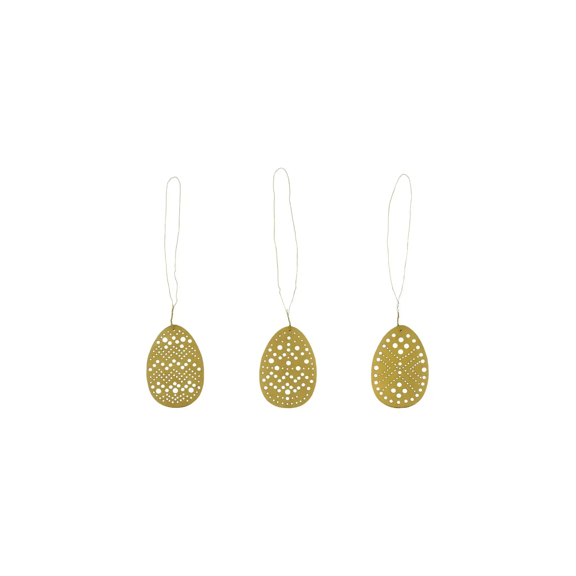 The set consists of three egg-shaped ornaments, each unique in shape and pattern. They are made of iron with an antique copper finish, giving them an elegant vintage look. With a width of 3 cm and a height of 4.5 cm, they are compact enough for a branch, wreath, or Easter bowl. Thanks to their light weight, you can easily hang them wherever you like.