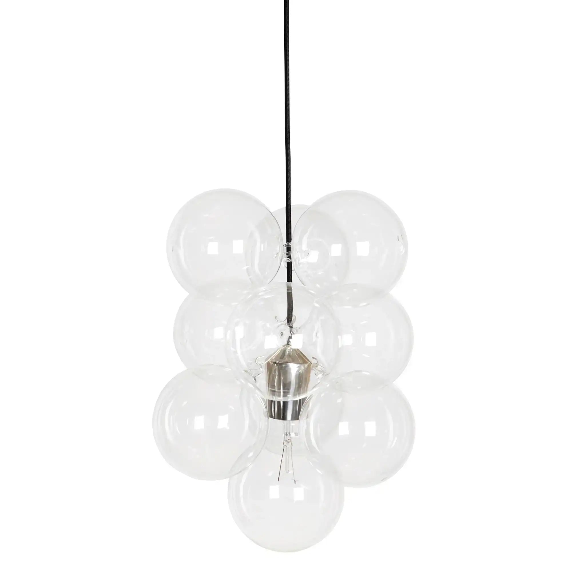 The lamp consists of twelve clear glass globes, complete with a three-meter long black cord. The parts are carefully finished with bakelite, a classic material that adds a subtle retro touch. The globes have a diameter of 12 cm and are delivered as a kit in a stylish canvas carrying bag.
