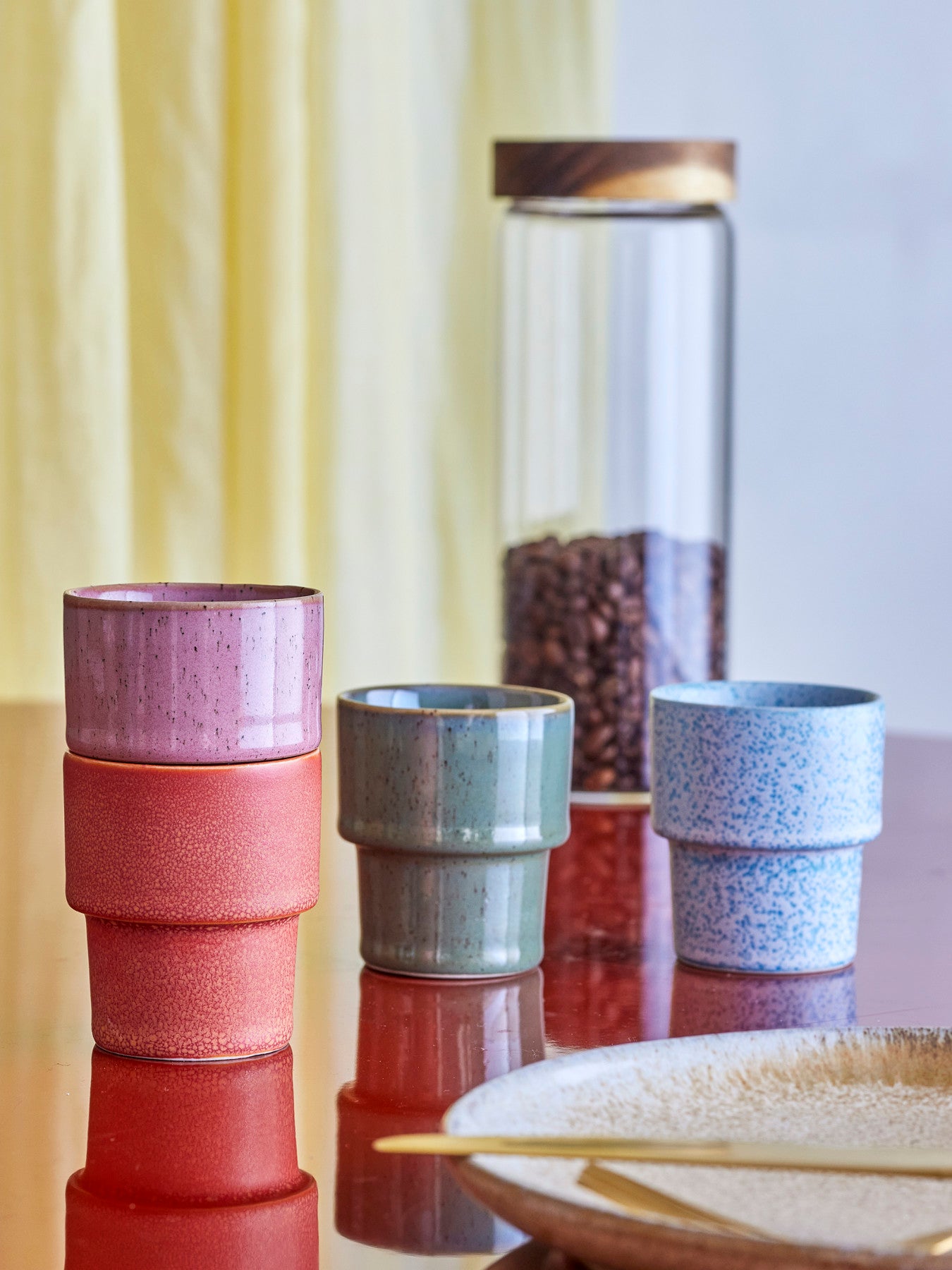 Details & material: Made of earthenware in multi-tones with a rustic finish; the reactive glaze creates lively nuances in warm, muted colours. The set includes four cylindrical cups, ø 6 cm, that sit comfortably in the hand and are easy to pair with your existing tableware. The light pinch detail breaks up the clean shape and adds character without taking over. Small differences in pattern and colour depth are part of the glaze and make each piece unique.