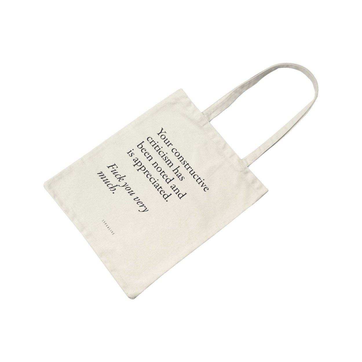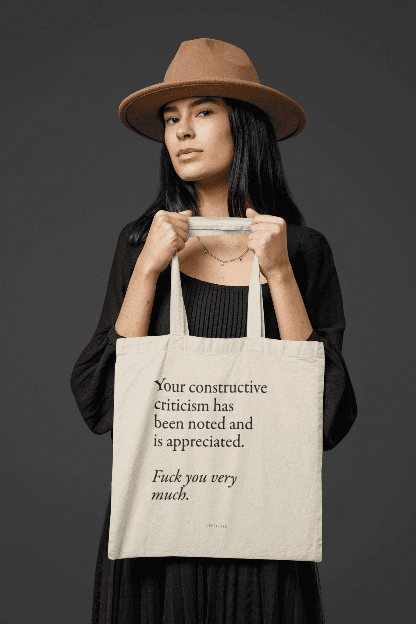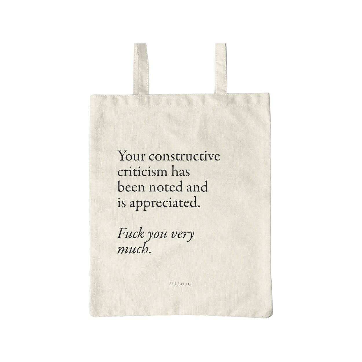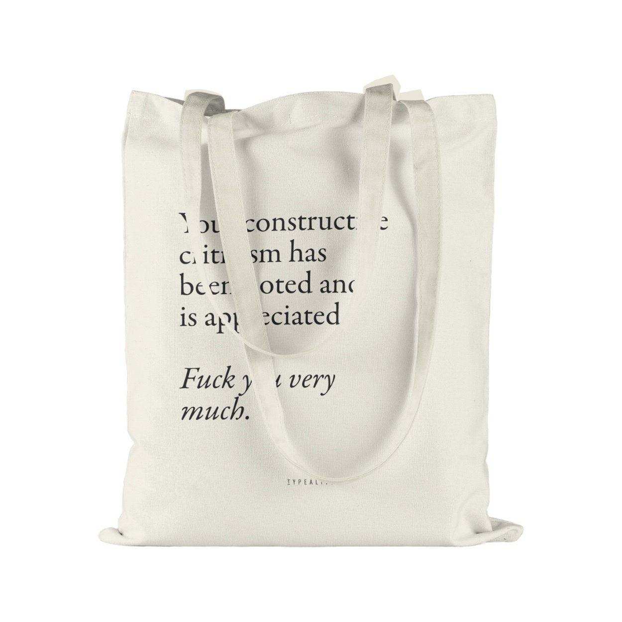The Typealive Cotton Bag Criticism is a stylish and bold bag that is perfect for any occasion. This natural colored bag features the black text: "Your constructive criticism has been noted and is appreciated. Fuck. You very much." Made from 100% oeko-tex certified cotton, this cotton shopper offers sustainability, humor and style in one.