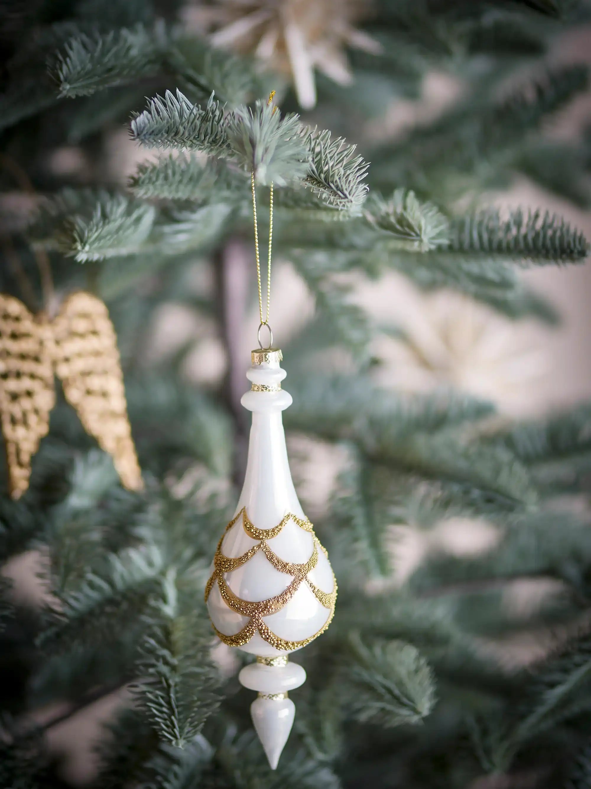 Details & Material: This elegant ornament is crafted from white glass and features an elongated shape, measuring 17 cm with a 6 cm diameter, making it stand out stylishly among your other Christmas decorations. The combination of the soft sheen and the refined gold is both timeless and unique, perfectly suited to the Scandinavian ambiance of Het Adres.