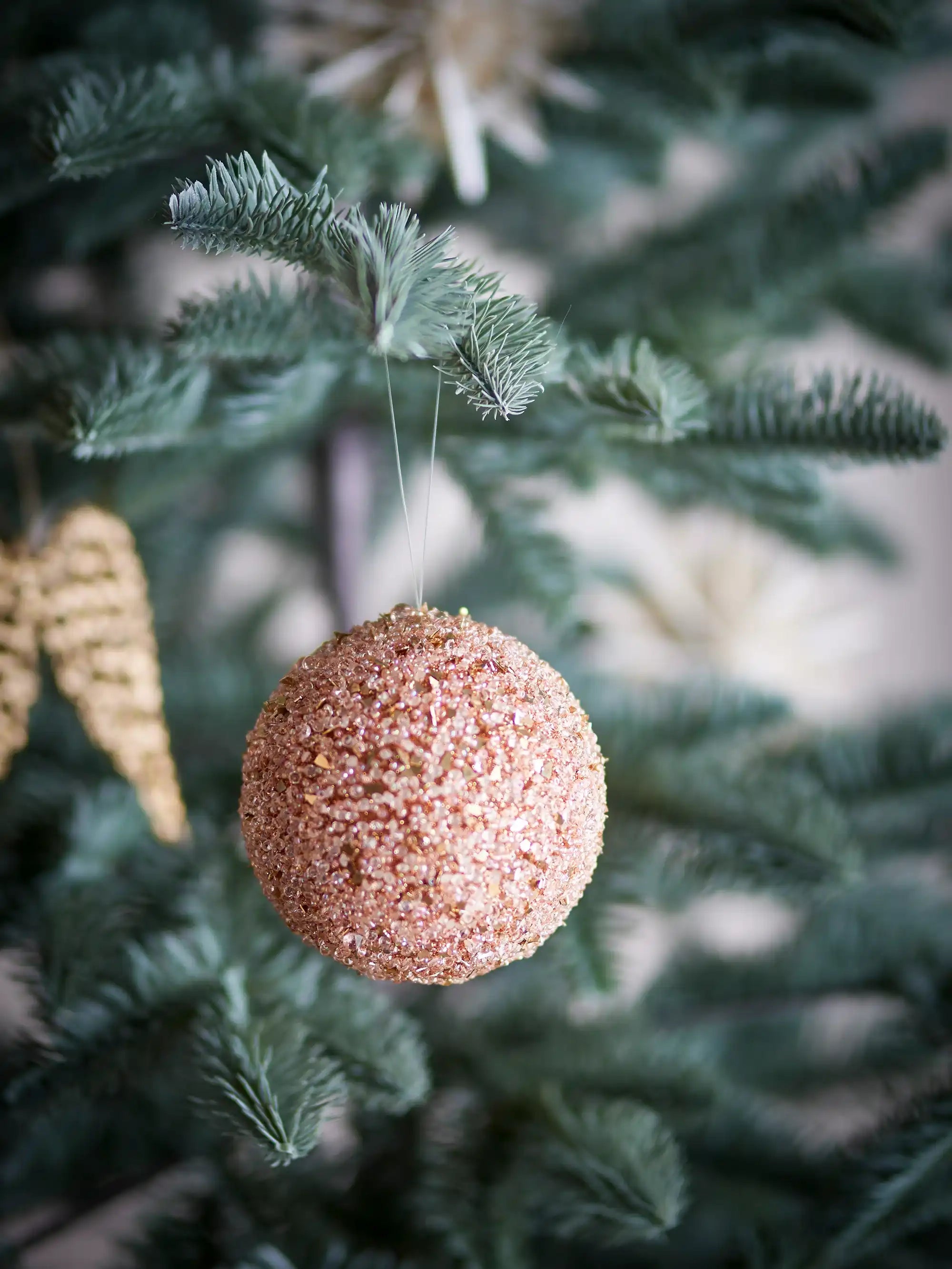 Details & Material: Crafted from lightweight plastic, the ornament is richly finished with fine beads and gold-colored glitter. Its 9 cm diameter makes it easy to hang on your Christmas tree or stylishly arrange on a tray – it catches every ray of light for a sparkling effect.
