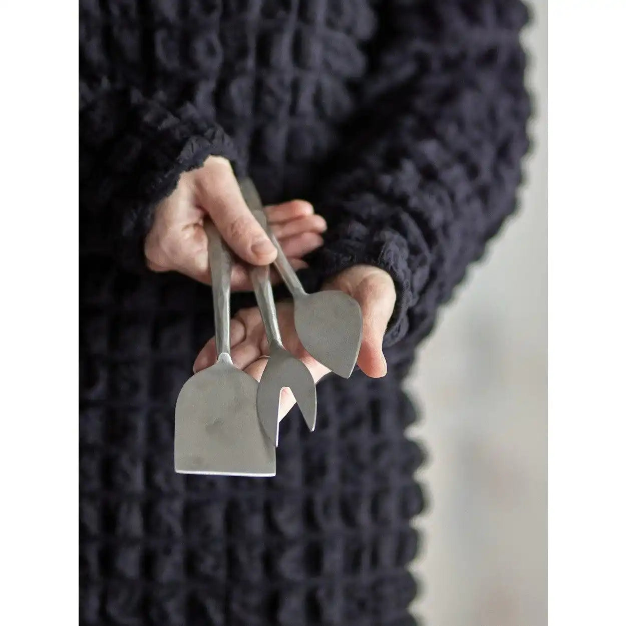 The Bloomingville Kinnie Cheese Knives - 3 Pieces are the perfect addition to an elegantly set table. This set consists of three stainless steel cheese knives, each designed for different types of cheese. The hammered handles add a unique and rustic look, making the knives not only functional but also decorative. Ideal for everyday use and special occasions such as dinners and drinks.
