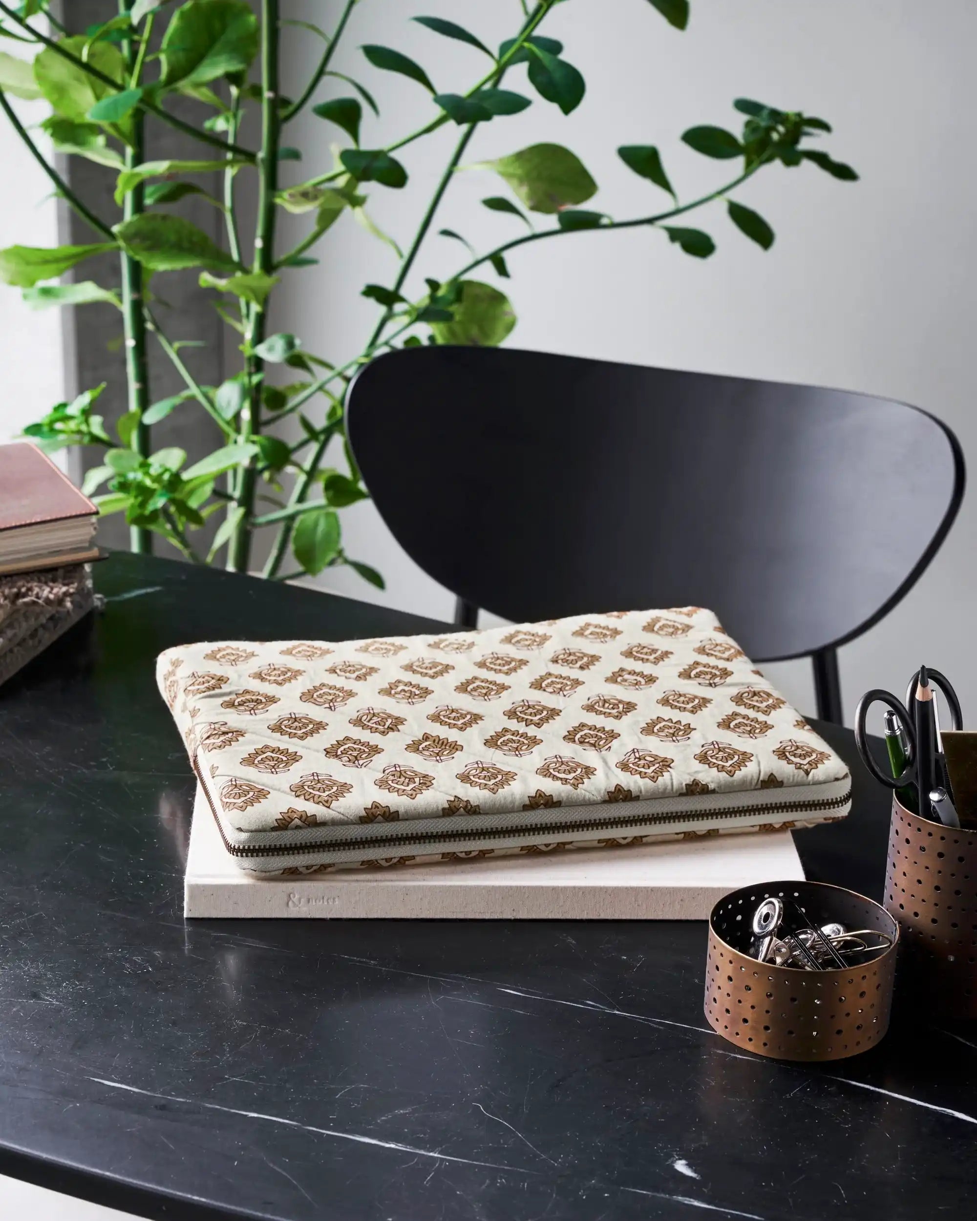 Made from sturdy cotton and designed for a 14-inch laptop, the sleeve protects against scratches and dust. The soft floral pattern adds a subtle, nostalgic twist to its calm appearance. Thanks to its compact size of 32 cm long, 23 cm wide, and 2 cm high, you can easily slip it into your bag or carry it lightly under your arm.