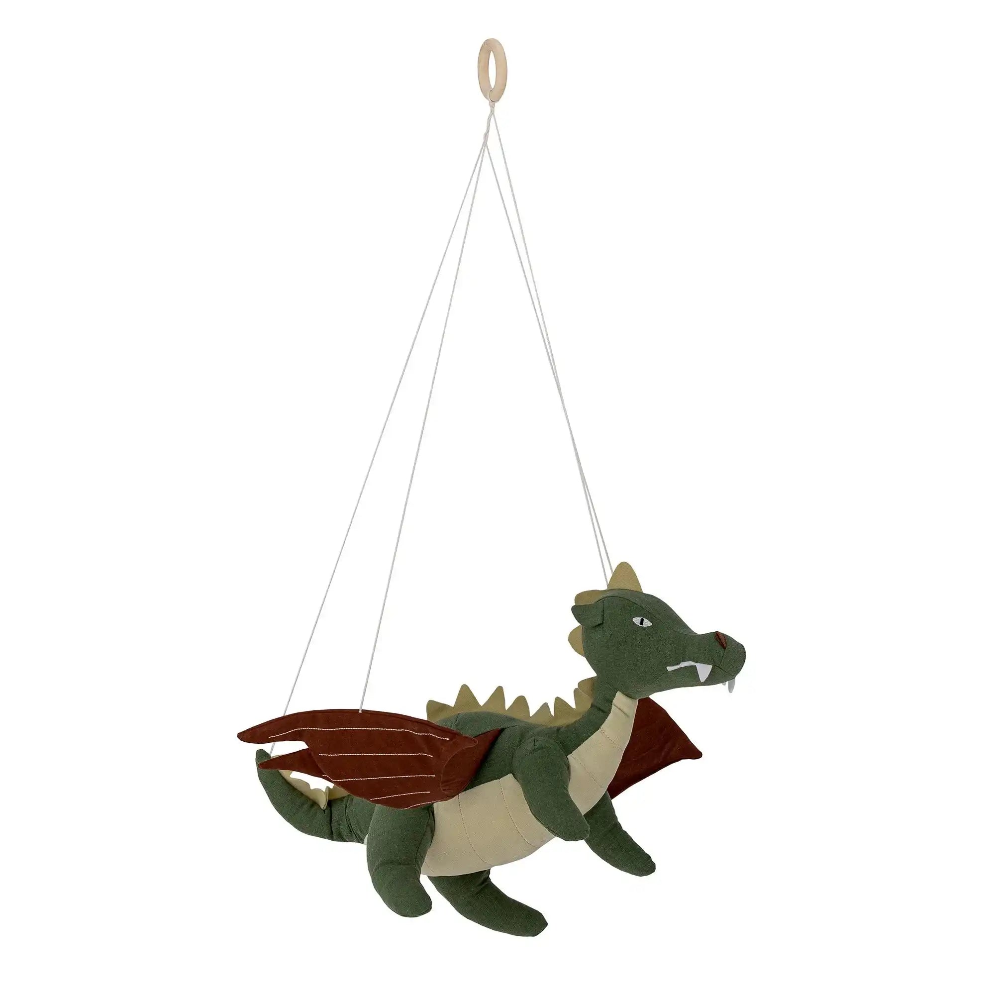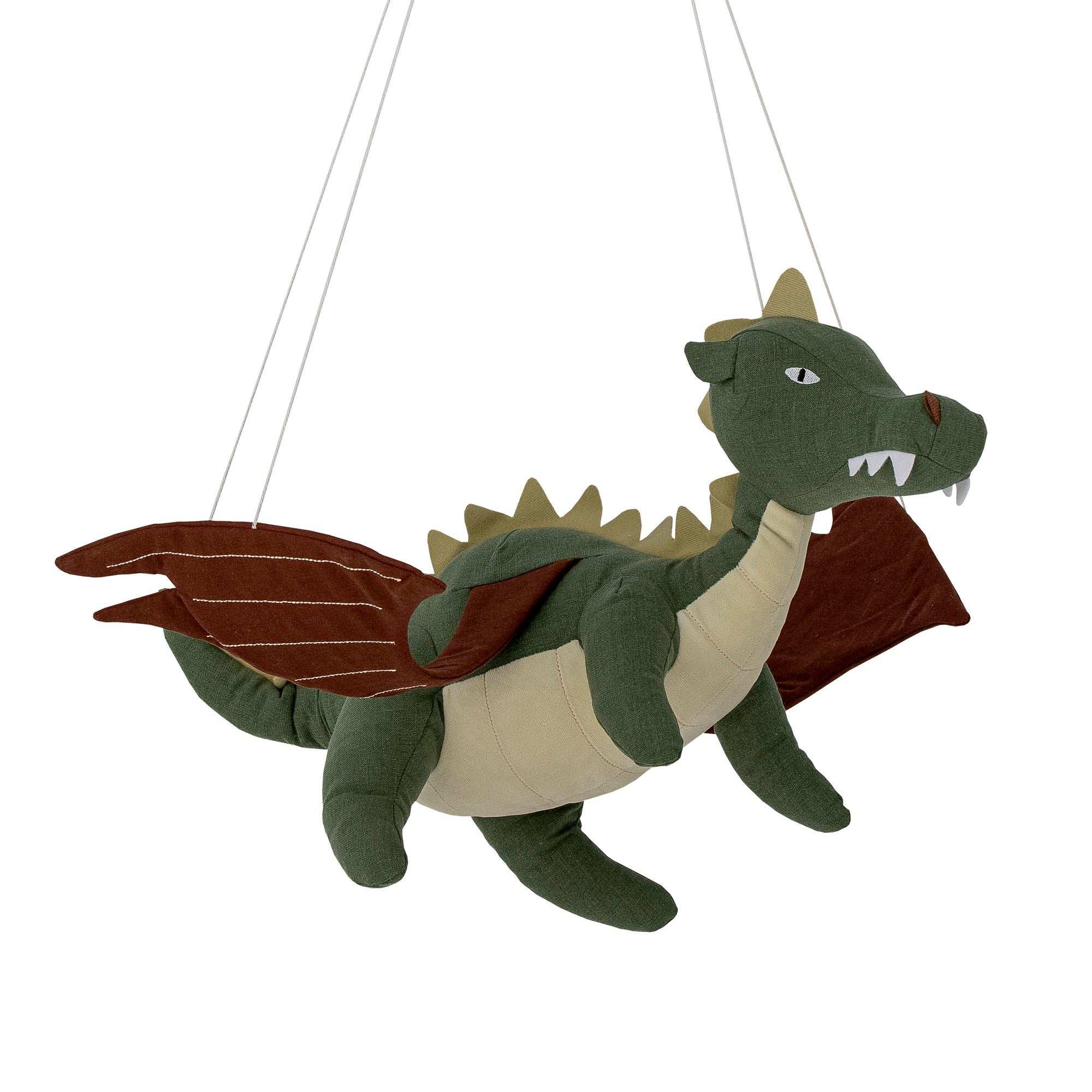 Details & material: This green mobile is made of linen, a light fabric that moves softly in the air. The dimensions are w × h × d 50 × 70 × 60 cm. The dragon stands out nicely, but isn’t overwhelming. The large wobbly wings create movement without being too busy. Please note: this is decoration, not a toy. Hang it high and out of your child’s reach.