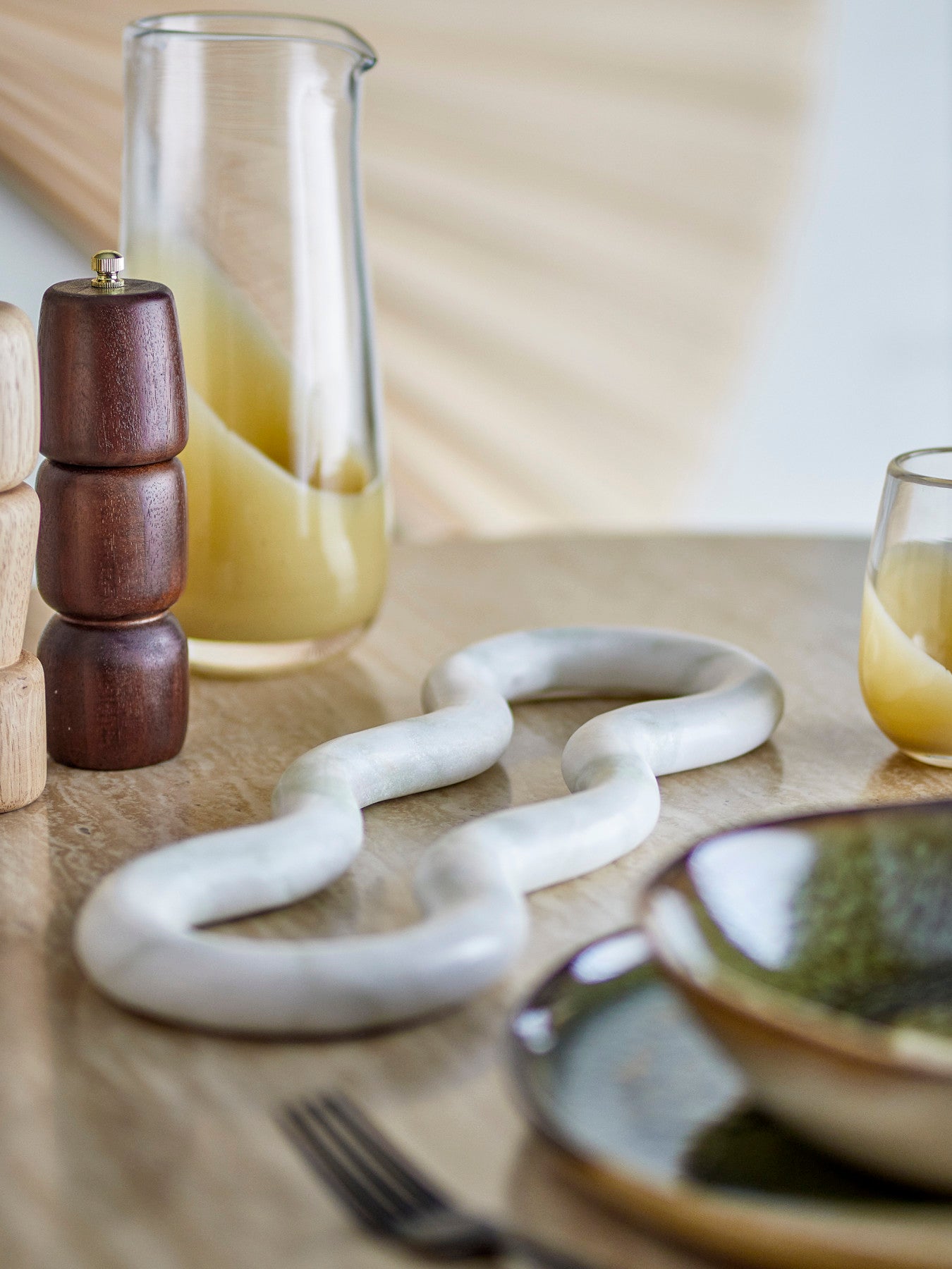 Why you’ll want the green marble coaster Vivien from Bloomingville: You’re looking for a coaster that is both practical and refined. This version in polished marble brings calm to the table and makes dishes stand out beautifully. The soft green shades shift subtly with the light, while the rippling shape gives those nuances extra depth. Use it as a quiet base for a serving bowl or carafe; the design adds atmosphere without taking over. Because marble is a natural material, each coaster has its own pattern, making your table moment feel just that bit more personal.