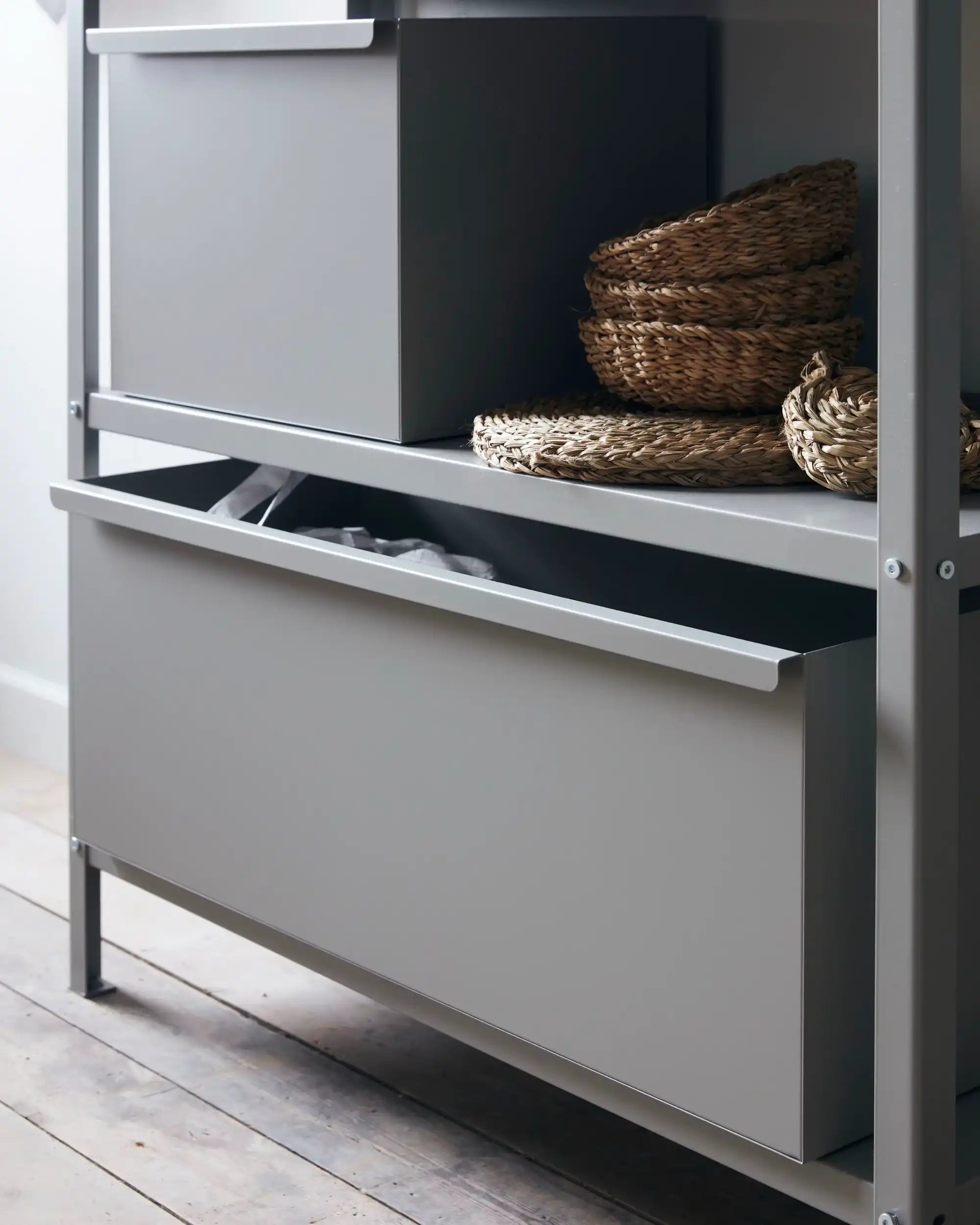 The sturdy metal design in stylish grey is 30 cm wide, 30 cm high, and 78 cm deep. Its sleek finish and thoughtful dimensions make it a natural addition to existing shelving units. Thanks to its subtle color, this unit blends effortlessly with various interior styles.