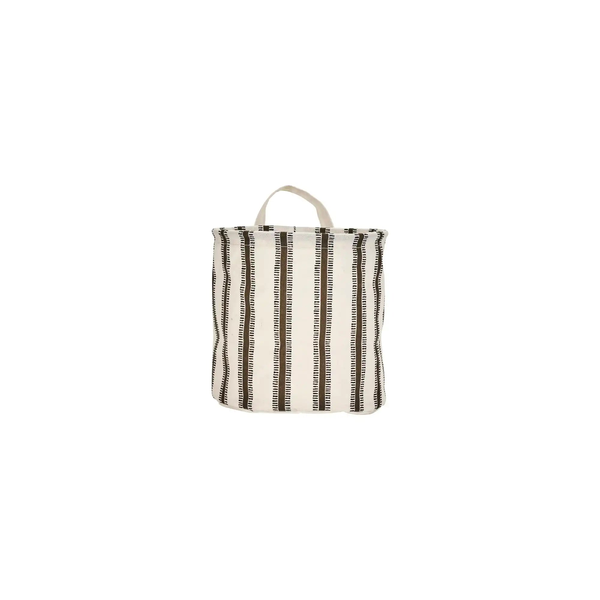 Made from sturdy polyester canvas in off-white with light brown details. The basket is 20 cm high with a diameter of 20 cm and keeps its shape thanks to the self-standing structure. You can easily place it or hang it up, depending on where you need extra storage.