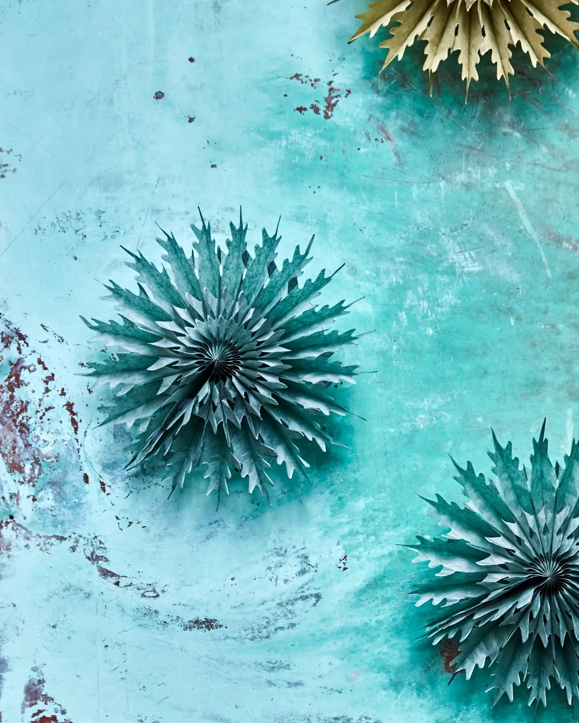 Add atmosphere to your home with these stylish green paper fans. Their playful shapes and refined details give any interior a warm, festive look — from subtly wintry to colorfully creative.