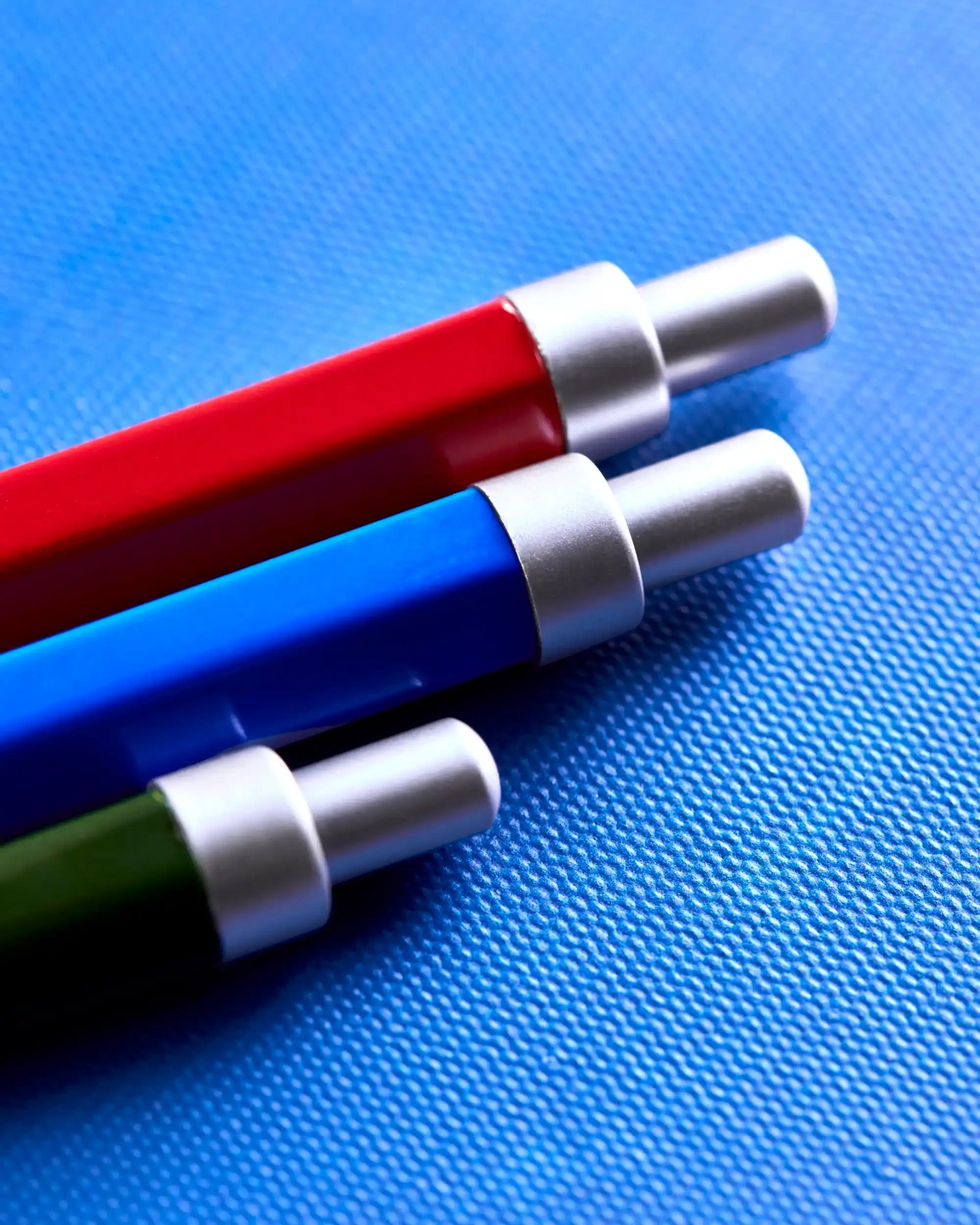Each pen in this set has its own color — blue, red, or green — and is made of lightweight aluminum. Thanks to the click mechanism, you write smoothly with black ink, perfect for everyday use. With a length of 13.5 cm and a slim diameter of 1 cm, they feel comfortable in your hand and fit easily into your pencil case or bag.