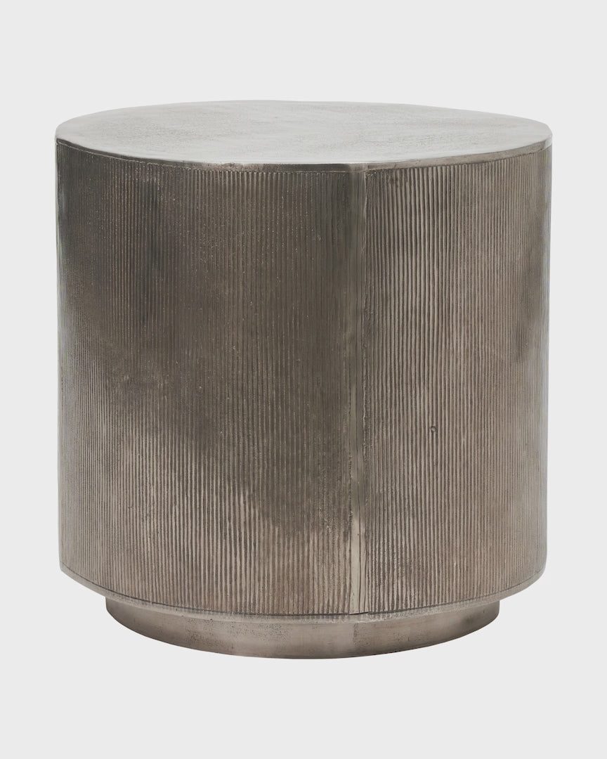 This round, silver-coloured coffee table is called Rota and was designed by the Danish House Doctor. The vertical grooves and the surface with intentional imperfections add charm and character to the simple design. Frame the table with a beautiful rug and add a personal touch by decorating it with your favourite vase. Silver tones add elegance to your living room par excellence. The Rota table has a timeless look that fits everywhere – even if your interior style changes over time. We recommend using coasters to protect the table top. Also available in a smaller size and other colours.