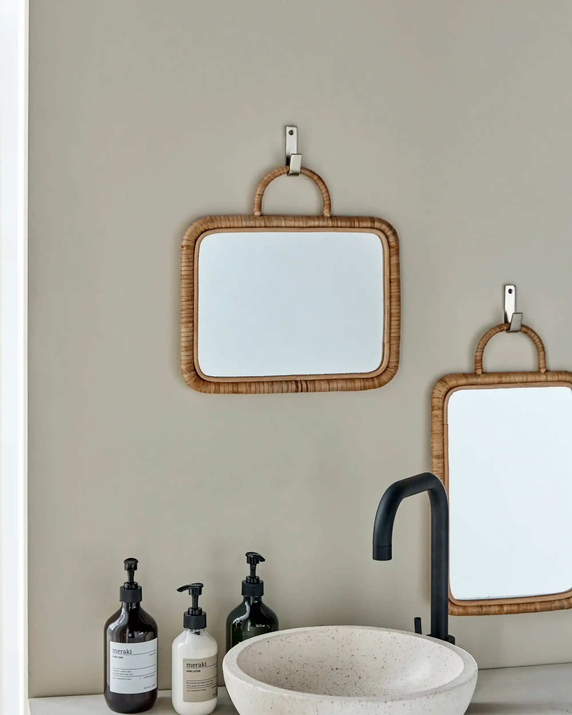 Looking for a stylish mirror that exudes warmth and tranquility? The Meraki Baki mirror with a rattan frame in Natural (24x32 cm) brings a unique combination of Scandinavian simplicity and natural charm to your interior. Thanks to its sleek design, this decorative wall mirror fits perfectly in a hallway, bedroom, bathroom, or living room.