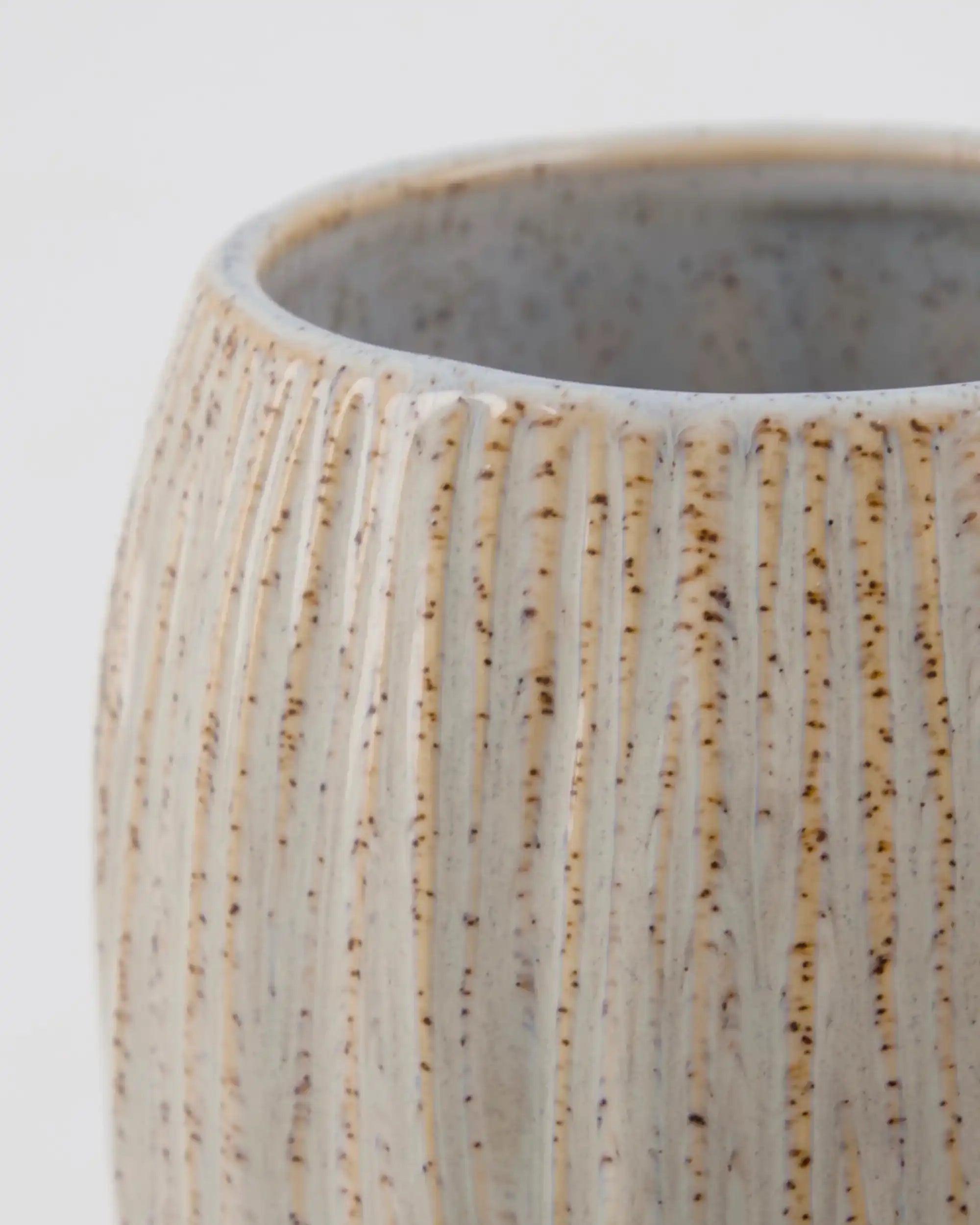 The cup is made of earthenware and has a handmade look that brings warmth to your interior. The glazed off-white finish gives it a gentle shine. With a height of 10.5 cm and a diameter of 9 cm, it fits effortlessly on a shelf, washbasin, or countertop.