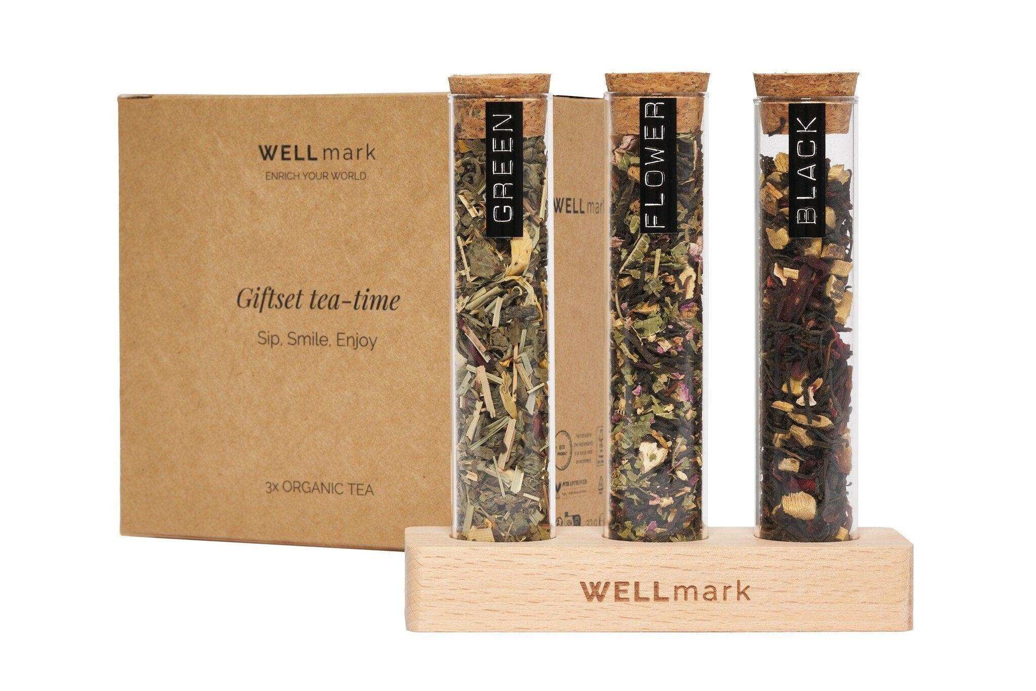 The Wellmark Tea gift set 3 flavors offers a unique and sustainable way to enjoy tea. The set contains flower, black and green tea, all organic and pure. These teas are not only tasty, but also environmentally friendly packed in reusable glass holders. The wooden display completes the whole, which gives a luxurious look to every tea moment. This set is perfect for a cozy high tea or a relaxing evening on the couch.
