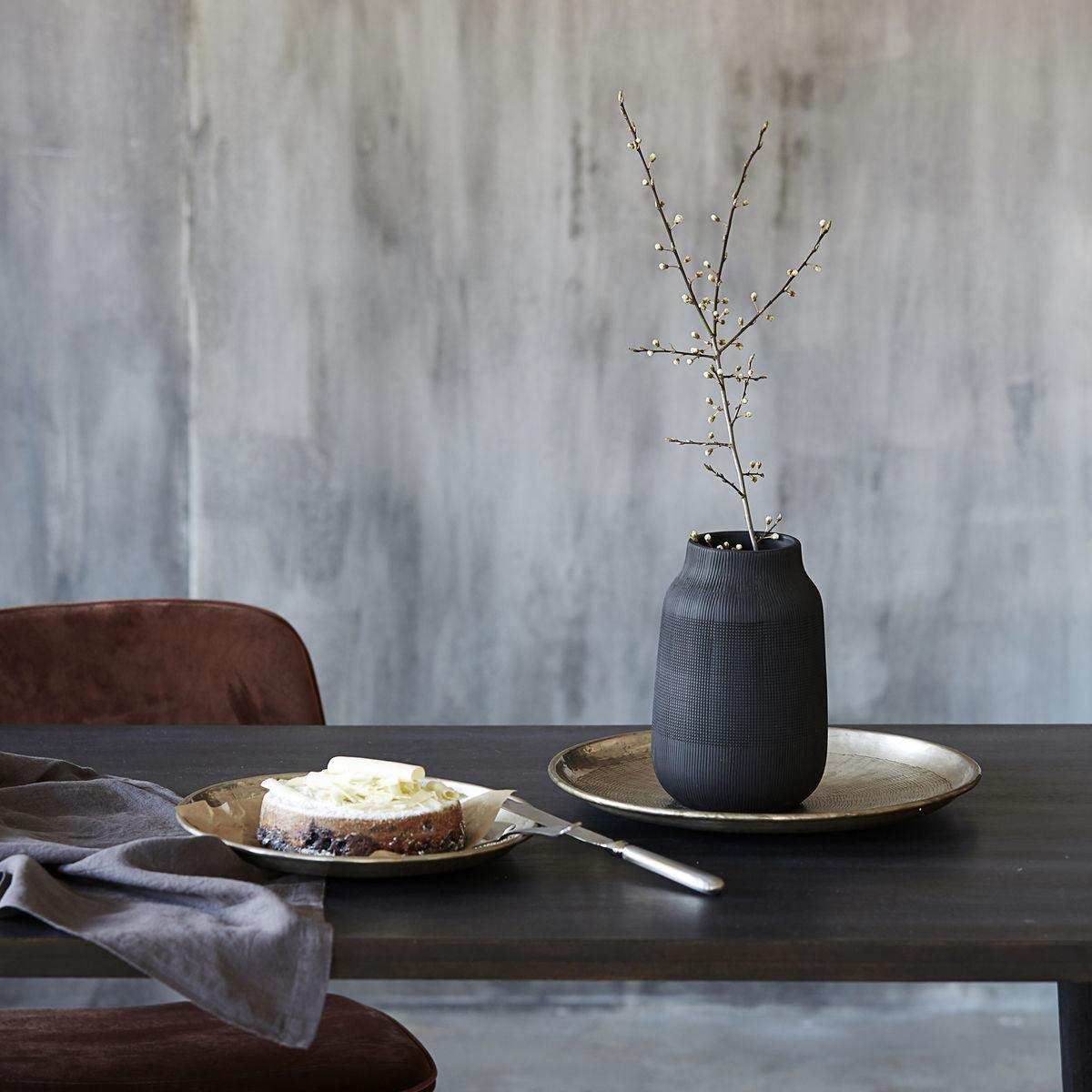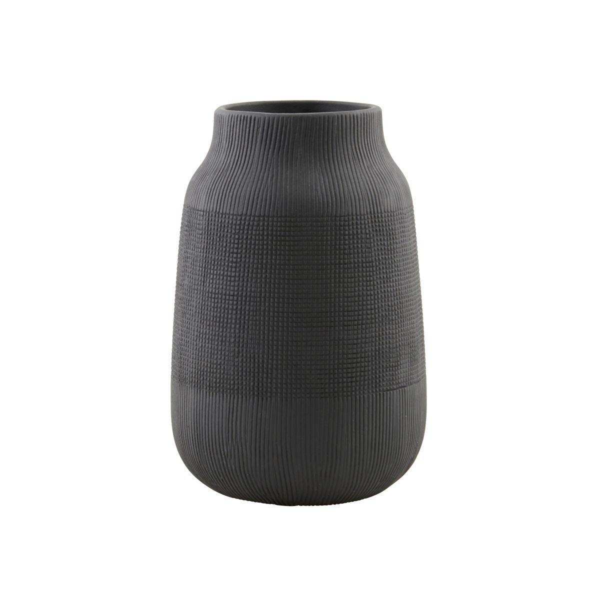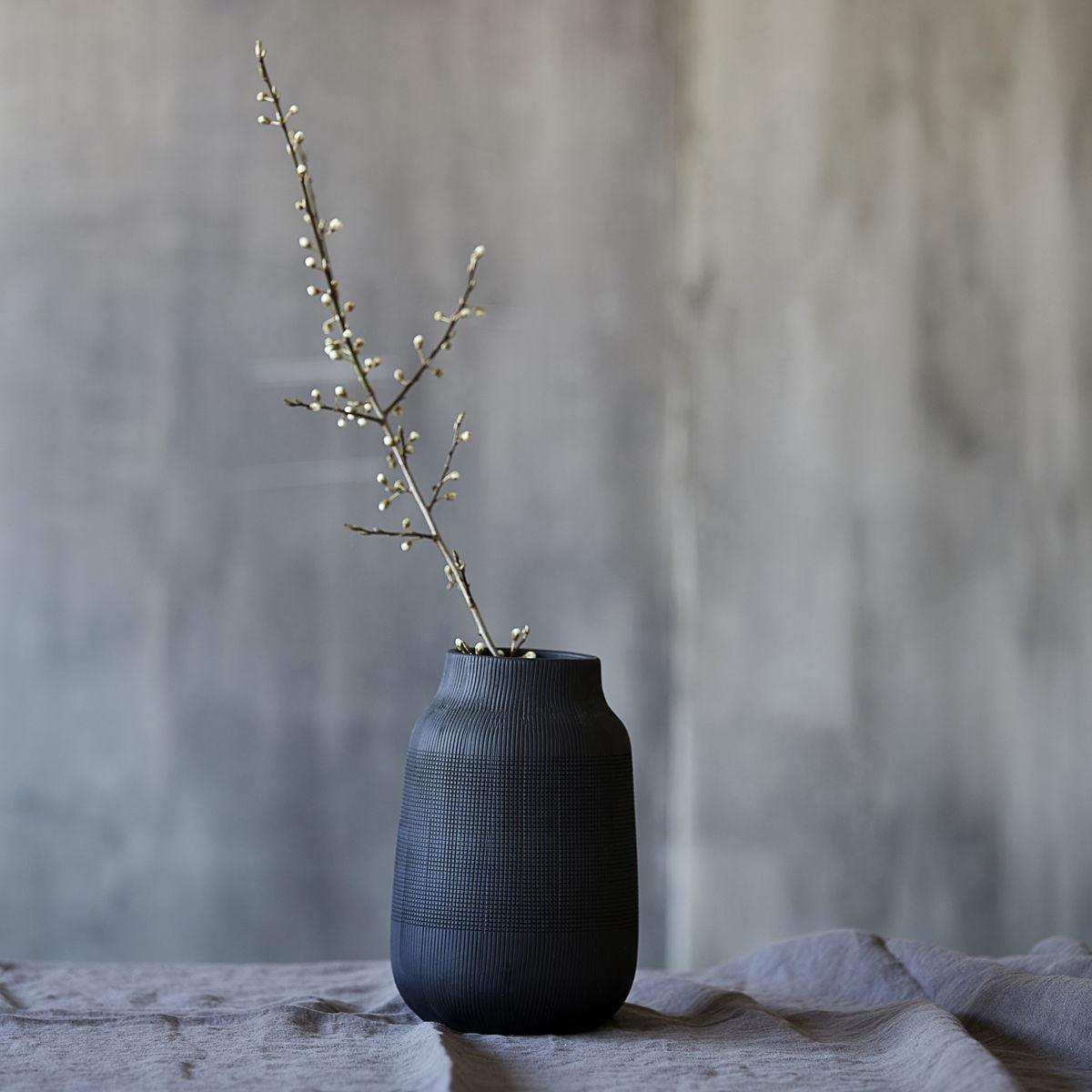 Discover the elegant look of the Groove Vase Black 22cm, a showpiece from the renowned House Doctor brand. This modern vase is made of clay and stands out with its sleek design. The black surface is enriched with a fine grooved pattern, which gives the vase a unique structure and a lot of character. The intense black colour in combination with the groove design makes this vase a striking appearance with a lot of originality. Perfect for a small bouquet, as a stylish detail on your dresser, shelf or table. Combine it with an elegant candlestick or your favourite trinkets for a personal touch.