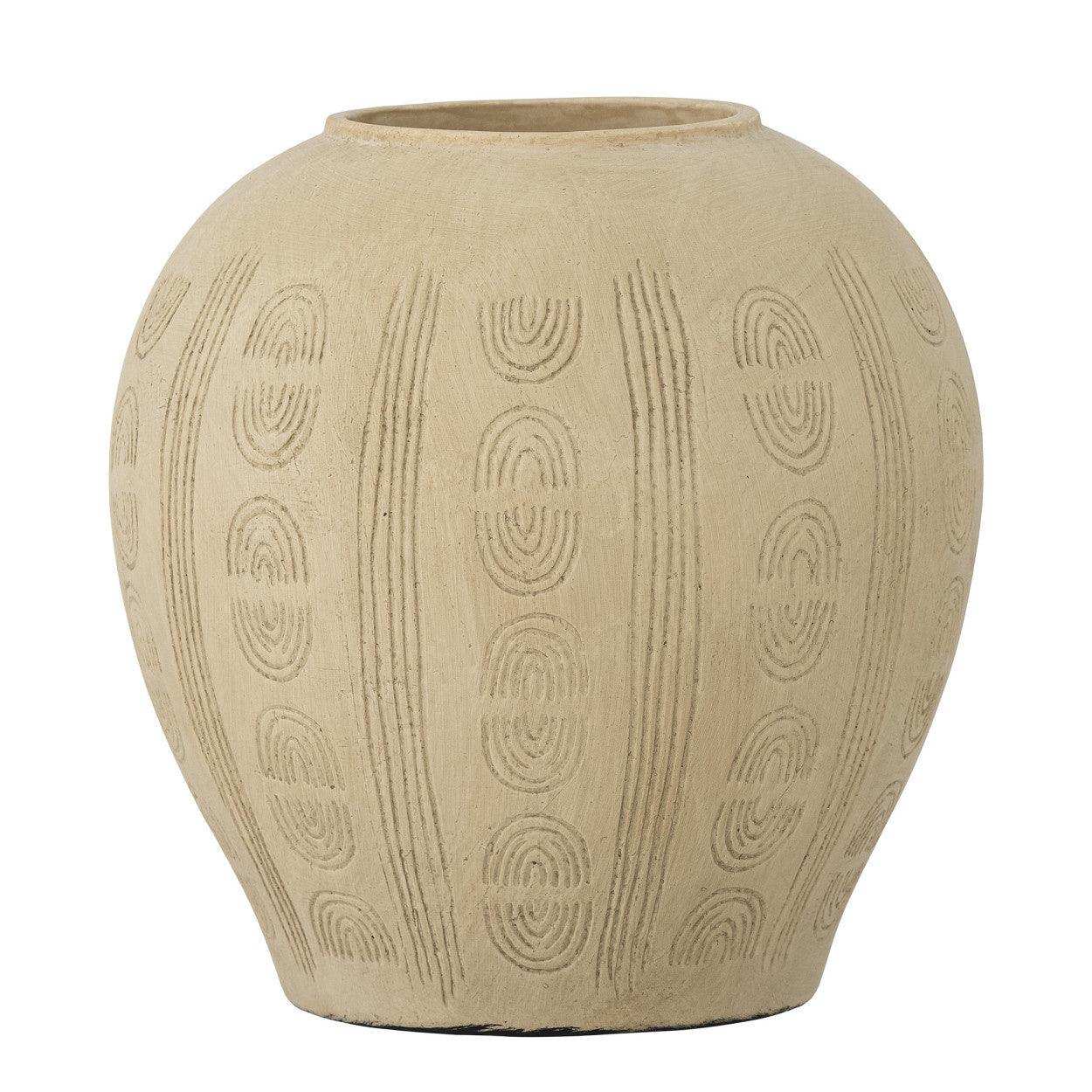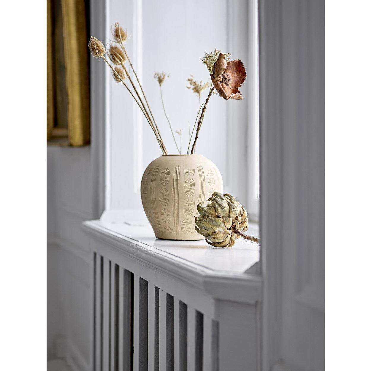 With a height, width and depth of 20 cm, the Bloomingville Vase Taym is ideal for displaying a single branch, dried flowers, or even as a standalone decorative object. The neutral shade of the terracotta vase fits perfectly into various interior styles, from boho-chic to modern minimalism. The understated, yet decorative look of the Taym vase ensures that it effortlessly adapts to your existing decoration, while at the same time creating a warm and earthy atmosphere.