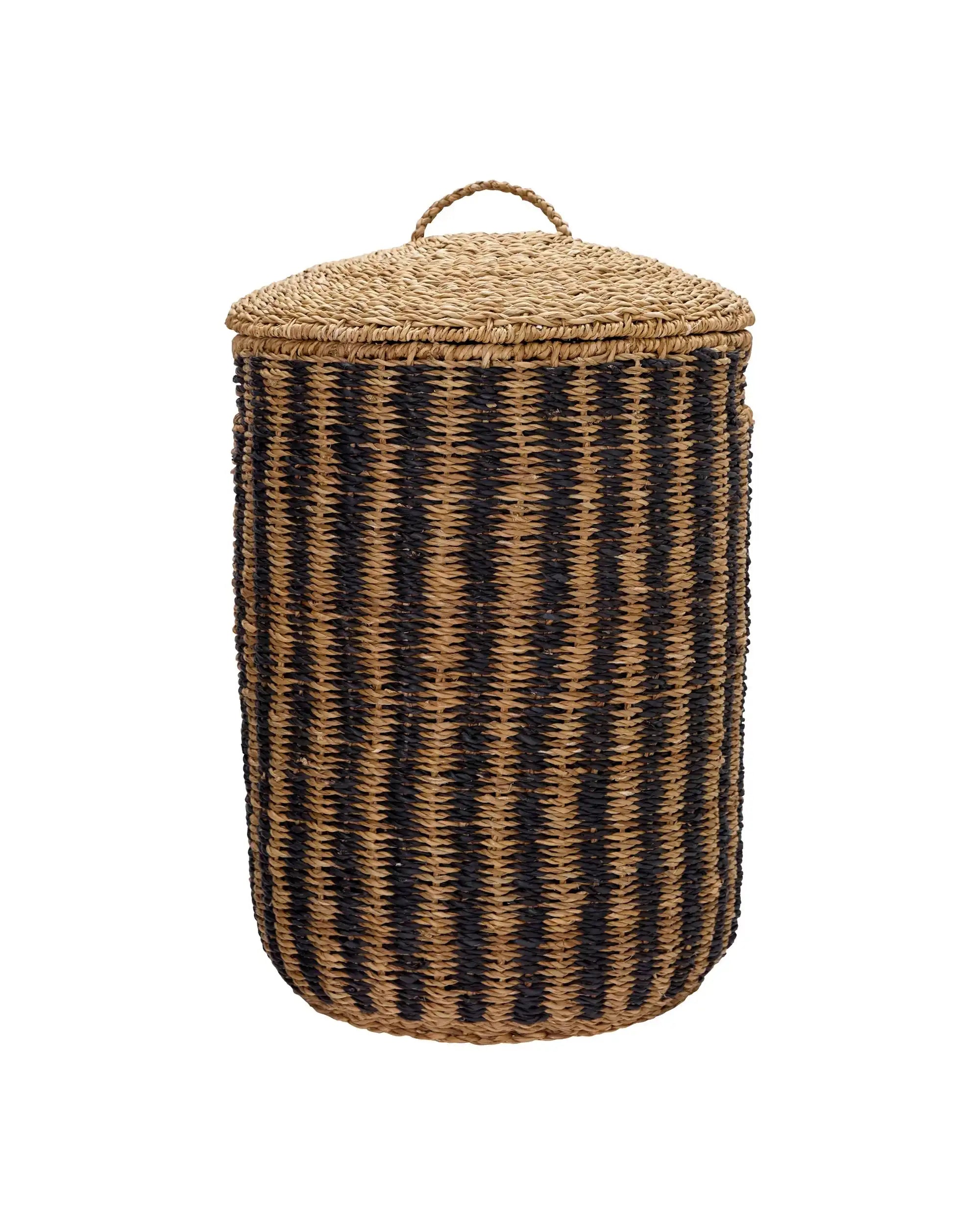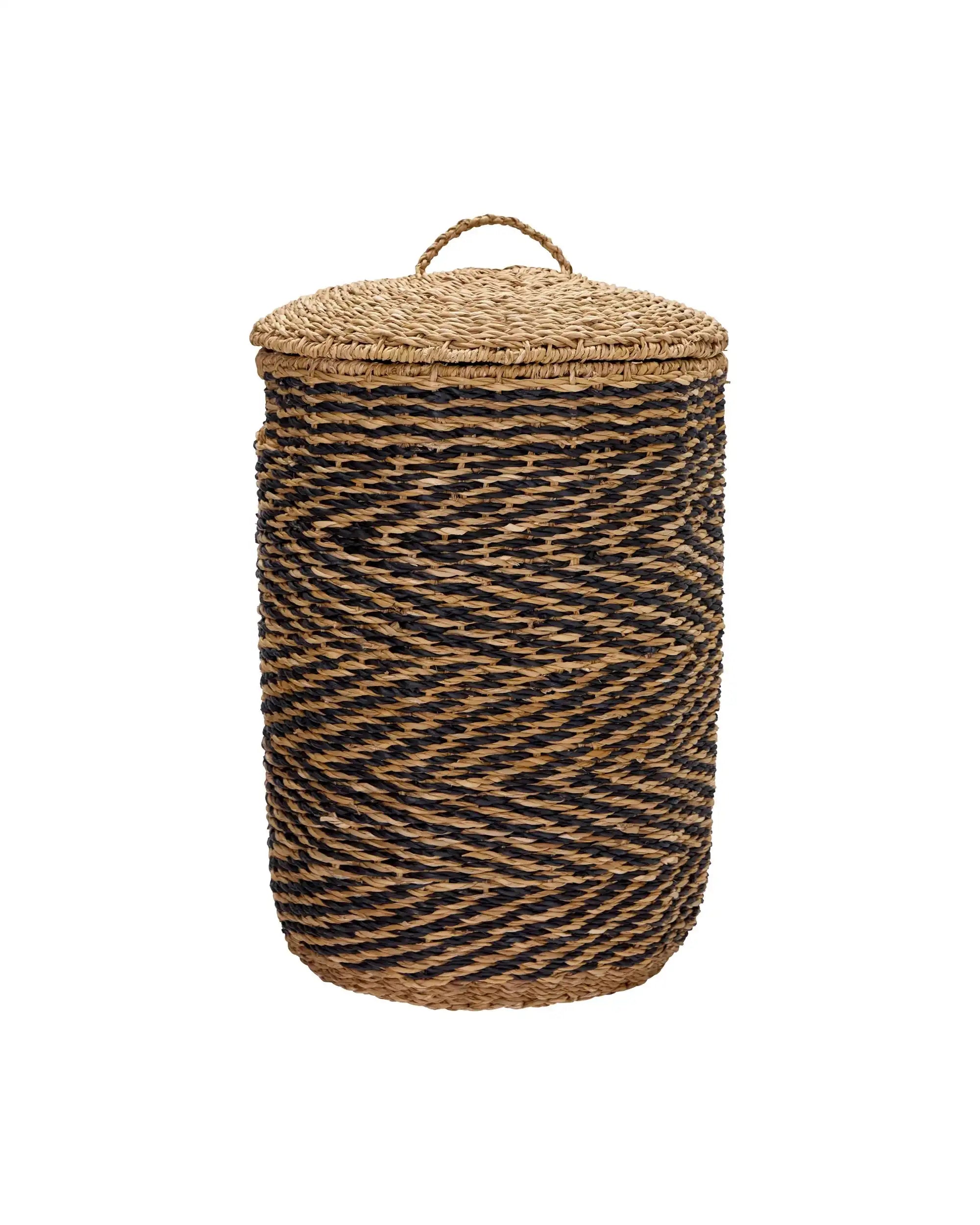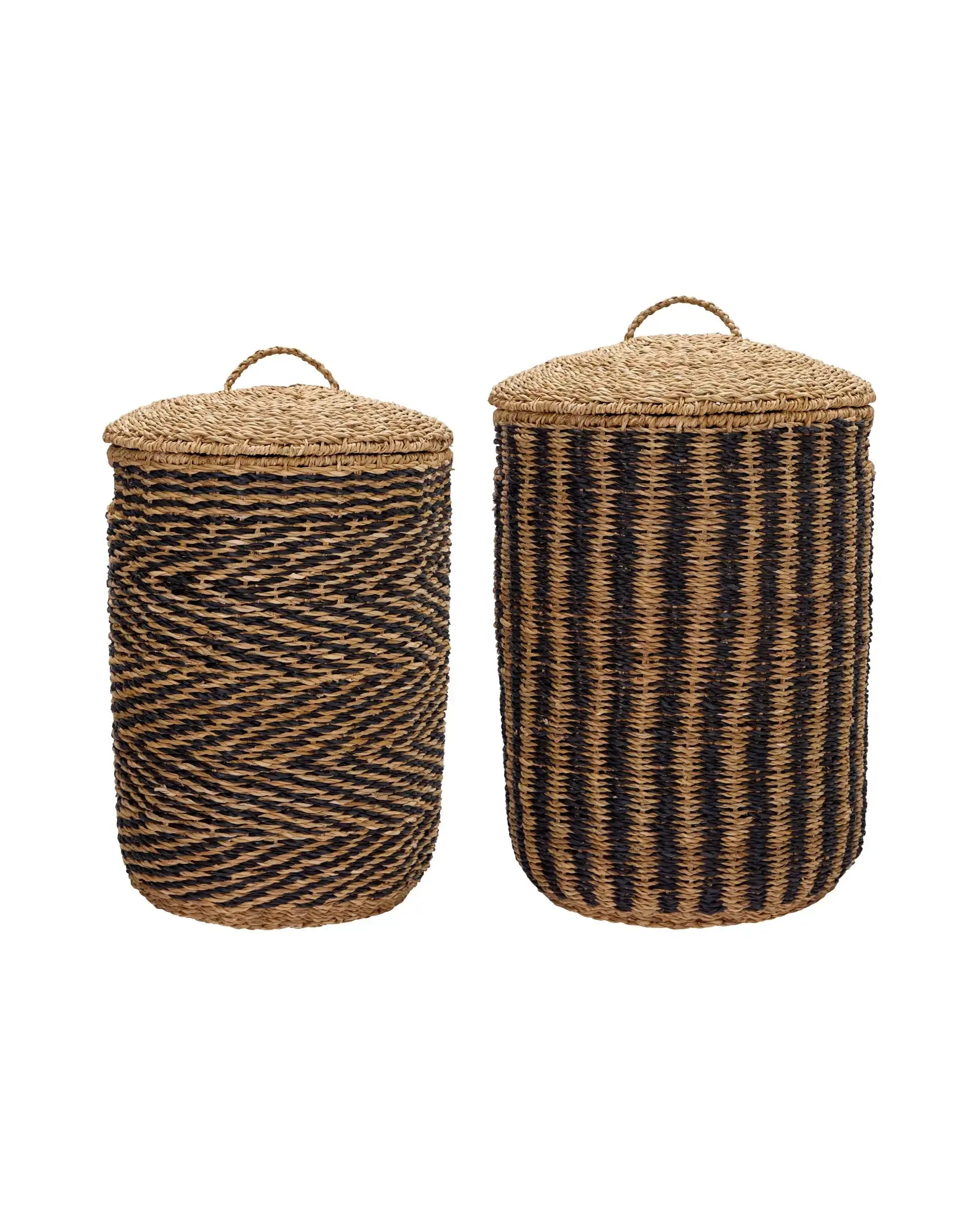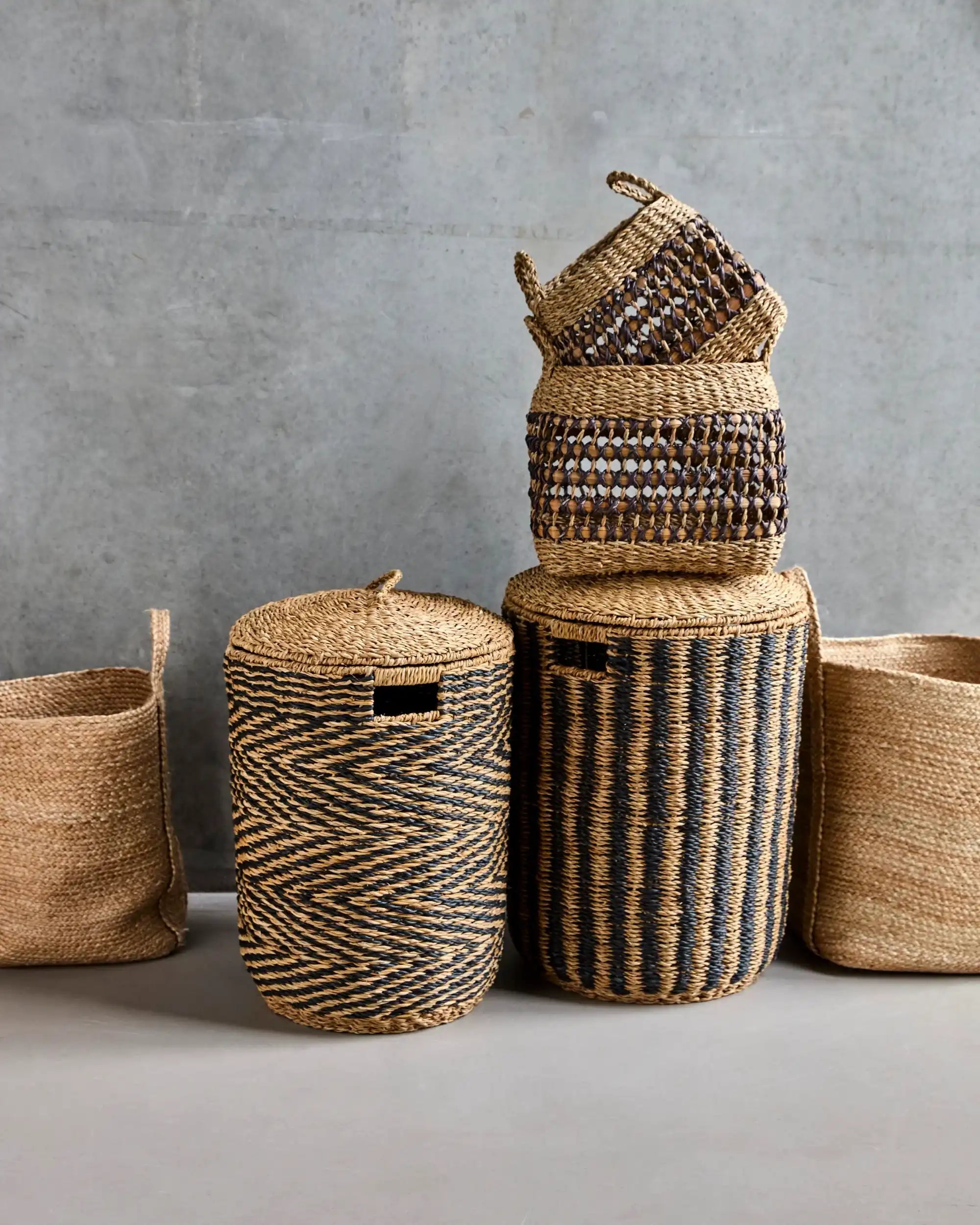Combine ambiance and functionality with the Cesto laundry basket set . This set of two handmade baskets is woven from 100% seagrass and features natural and black patterns that will enhance any interior. Both baskets have a removable lid and a unique woven pattern, making them both practical and decorative. Ideal for collecting laundry, storing throws, or keeping toys tidy—from the bathroom to the living room.